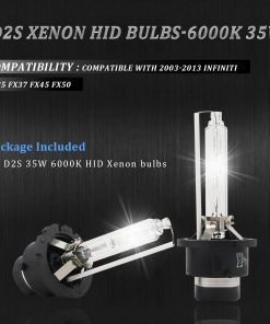 Bombillas de faros HID de xenón D2S 6000K blanco frío 35W compatibles con 2003-2013 Infiniti FX35 FX37 FX45 FX50. Luz blanca cómoda de color blanco diurno 6000K, mucho más claro que los 4300K amarillos estándar. Fabricación estandarizada de alta calidad y material de cristal anti-UV para garantizar un rendimiento excelente y una excelente vida útil. Instalación plug-n-play diseñada para adaptarse a su carcasa OEM de fábrica sin necesidad de cableado o modificación. Incluye 2 bombillas HID de xenón D2S 35W 6000K.