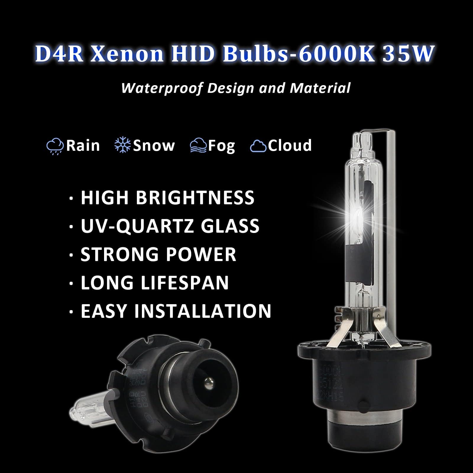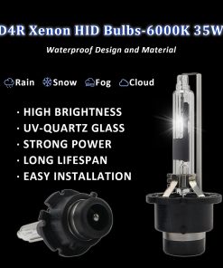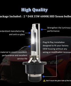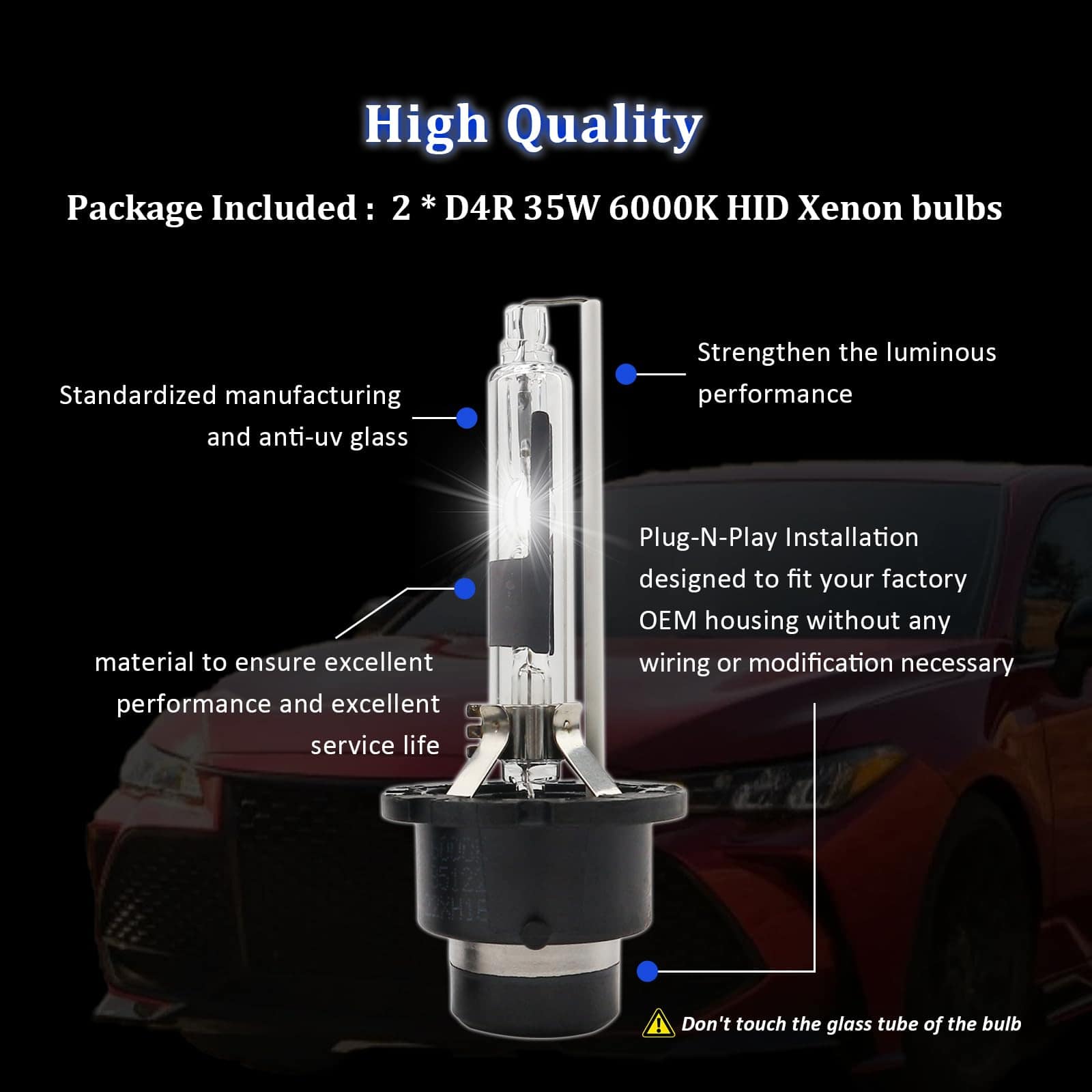 Bombillas de faros Xenón HID D4R 6000K Blanco Frío 35W Compatible con Toyota Avalon 2008-2010. Las bombillas de xenón HID D4R proporcionan una luz blanca cómoda de 6000K, que es mucho más clara que la estándar amarilla tenue de 4300K. Fabricadas con material de vidrio anti-UV de alta calidad y con un diseño Plug-N-Play para una instalación fácil y sin necesidad de modificaciones. El paquete incluye 2 bombillas de xenón HID D4R 35W 6000K.