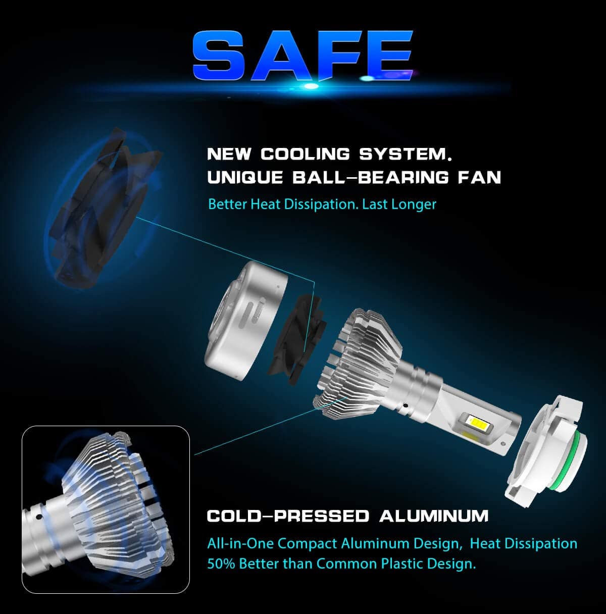 3. ENFRIAMIENTO POTENTE Y CONFIABLE: El disipador de calor de aluminio de aviación con un sistema de ventilador de doble rodamiento de bolas de alta velocidad e impermeable mantiene la bombilla funcionando a su máximo potencial. No más ruido, los ventiladores en las bombillas son mucho más silenciosos (casi silenciosos).