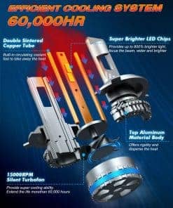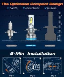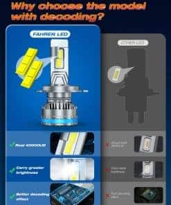 Las bombillas FAHREN H4 / 9003 ofrecen un brillo mejorado de 40000LM y 120W por par, lo que representa un aumento del 800% en brillo en comparación con las bombillas halógenas estándar. Con una temperatura de color de 6500K, estas bombillas proporcionan colores más claros y vívidos para una mejor visibilidad y seguridad al conducir. El diseño ultrafino de las bombillas posiciona los chips más cerca, creando un patrón de haz perfecto que ilumina de manera amplia y de mayor alcance sin deslumbrar o crear puntos oscuros, garantizando una conducción más segura. La instalación es rápida y sencilla, siendo casi idéntica a la de las bombillas halógenas de fábrica para una experiencia de plug-and-play. Incluyen un decodificador adicional para un rendimiento óptimo. Construidas con aluminio aeroespacial para una excelente disipación del calor, un diseño de disipador de calor finamente elaborado y un ventilador de enfriamiento turbo de 15,000 RPM, estas bombillas cuentan con una vida útil de más de 60,000 horas, reduciendo la necesidad de reemplazos frecuentes. Son compatibles con el 99% de los vehículos, aunque algunos modelos sensibles pueden requerir un decodificador CANBUS adicional para una mejor compatibilidad. Es importante tener en cuenta que el sistema de compatibilidad puede no ser 100% preciso o actualizado, por lo que se recomienda consultar el manual del usuario o el número de parte de las bombillas originales para confirmar la compatibilidad.