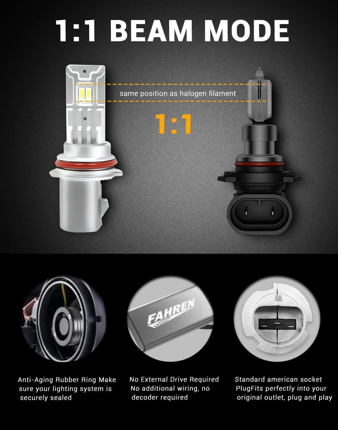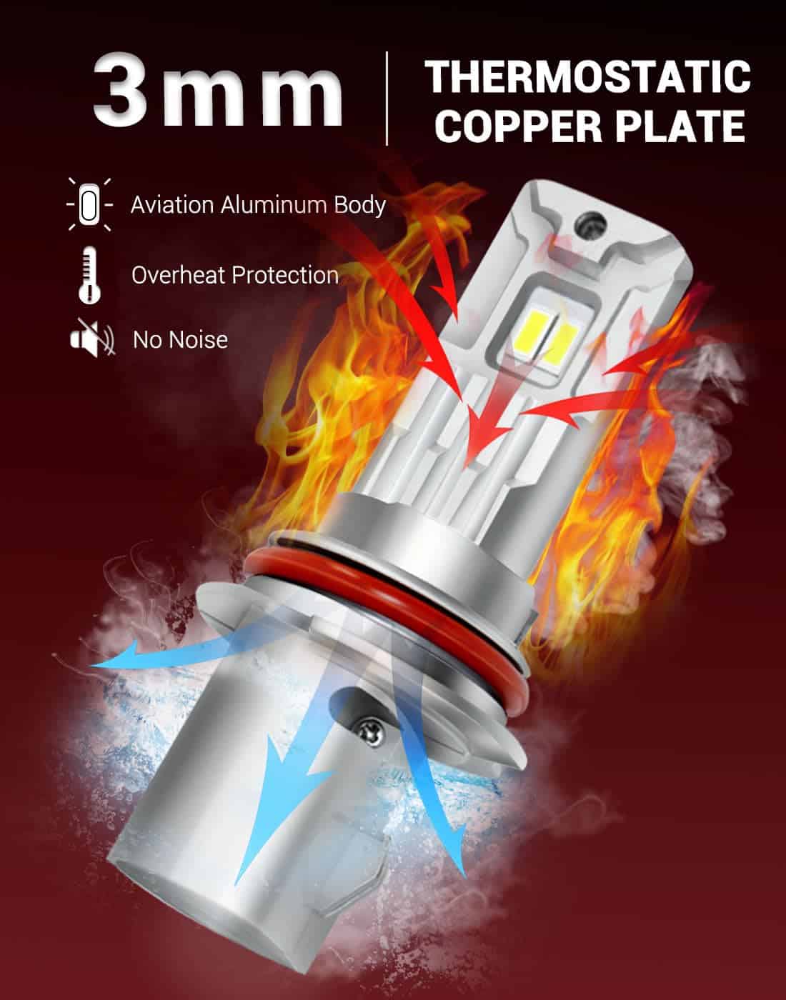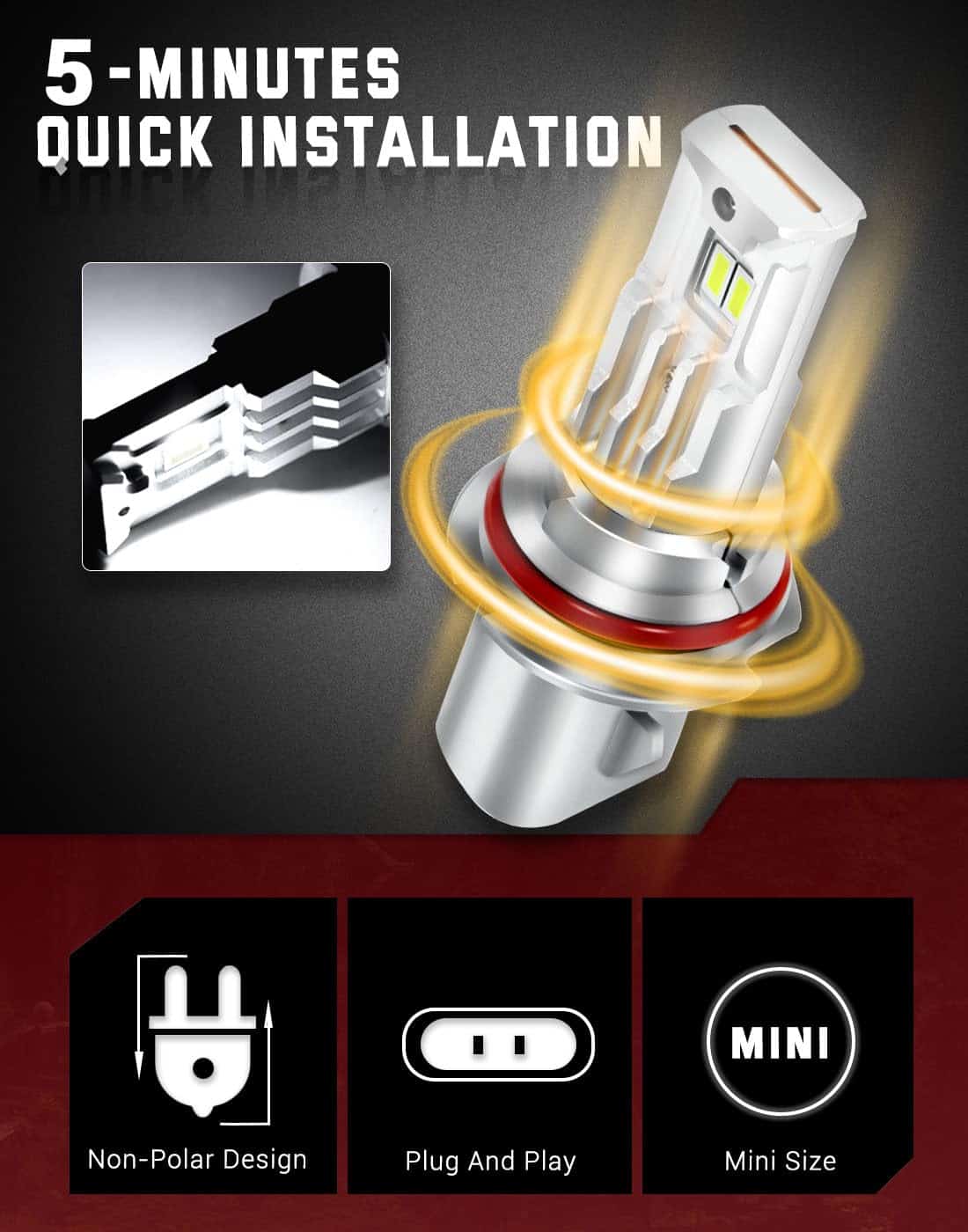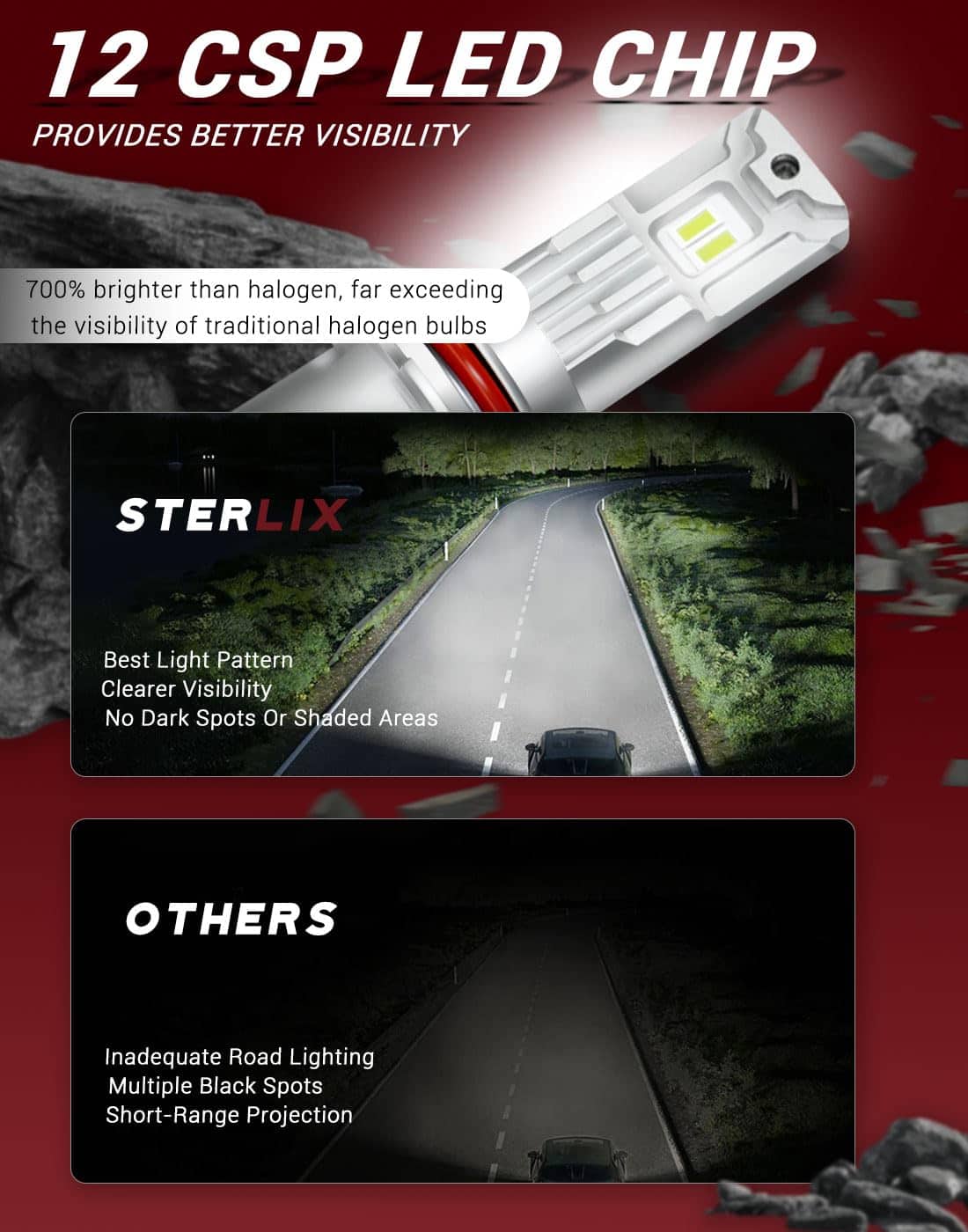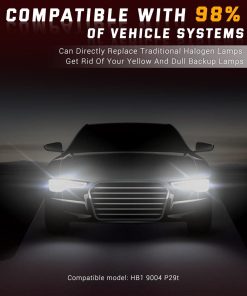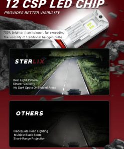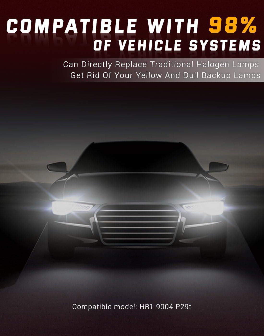 Bombillas de alta luminosidad 9004 equipadas con 12 chips LED CSP de alto rendimiento son un 600% más brillantes que las halógenas y logran una salida de luz máxima de 20000LM, superando ampliamente la visibilidad de las bombillas halógenas tradicionales. Su tamaño más pequeño, mayor densidad de luz, mejor efecto de control de luz, proporciona una luz más clara y precisa, garantizando la seguridad en la conducción nocturna y en condiciones climáticas adversas.