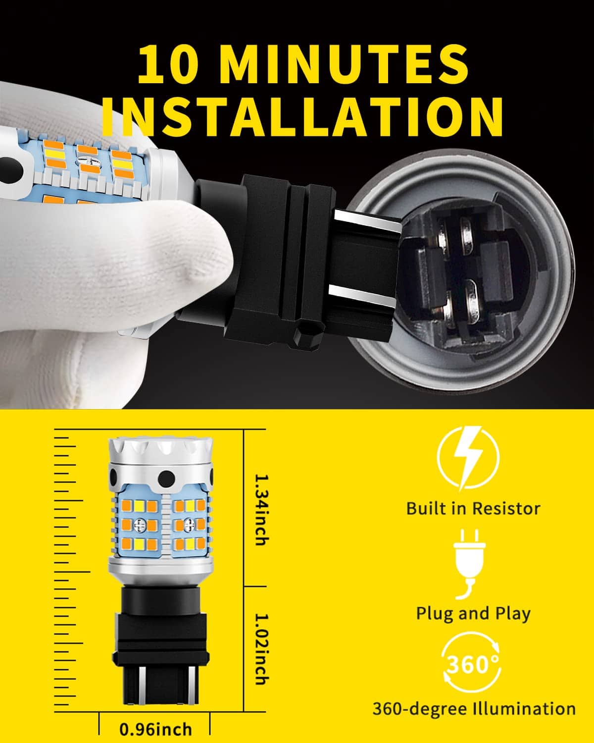 4. Instalación en 10 minutos Todo en una bombilla LED intermitente 3157 sin errores, módulo con resistor incorporado, diseño sin polaridad, enchufar y listo, lo que tarda solo 10 minutos en instalar. Si tiene alguna pregunta, contáctenos para obtener ayuda y soluciones.