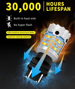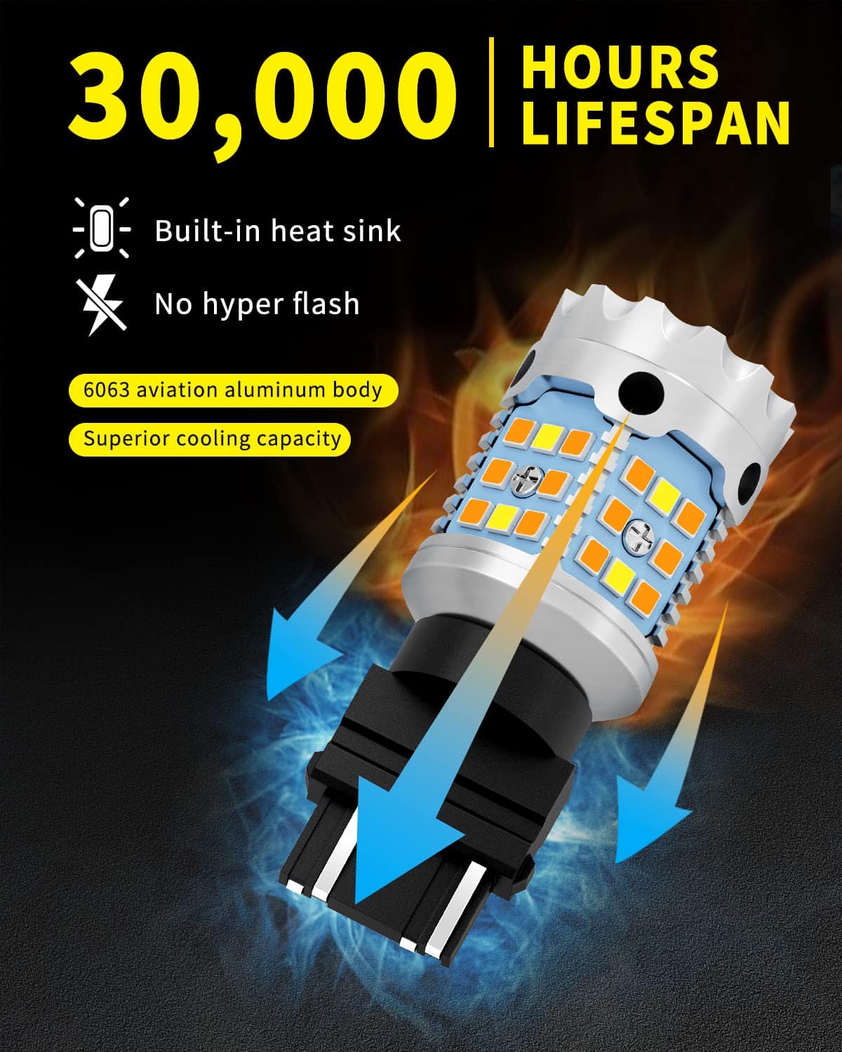 2. 30,000hrs de vida útil Larga Todo el cuerpo de aluminio de aviación 6063 brinda una capacidad de enfriamiento superior, con controlador de corriente constante IC incorporado y un excelente sistema de control inteligente de temperatura, para asegurar que las luces intermitentes LED MEALAM 3157 tengan una vida útil más larga de 30,000 horas.