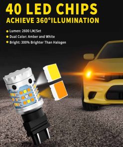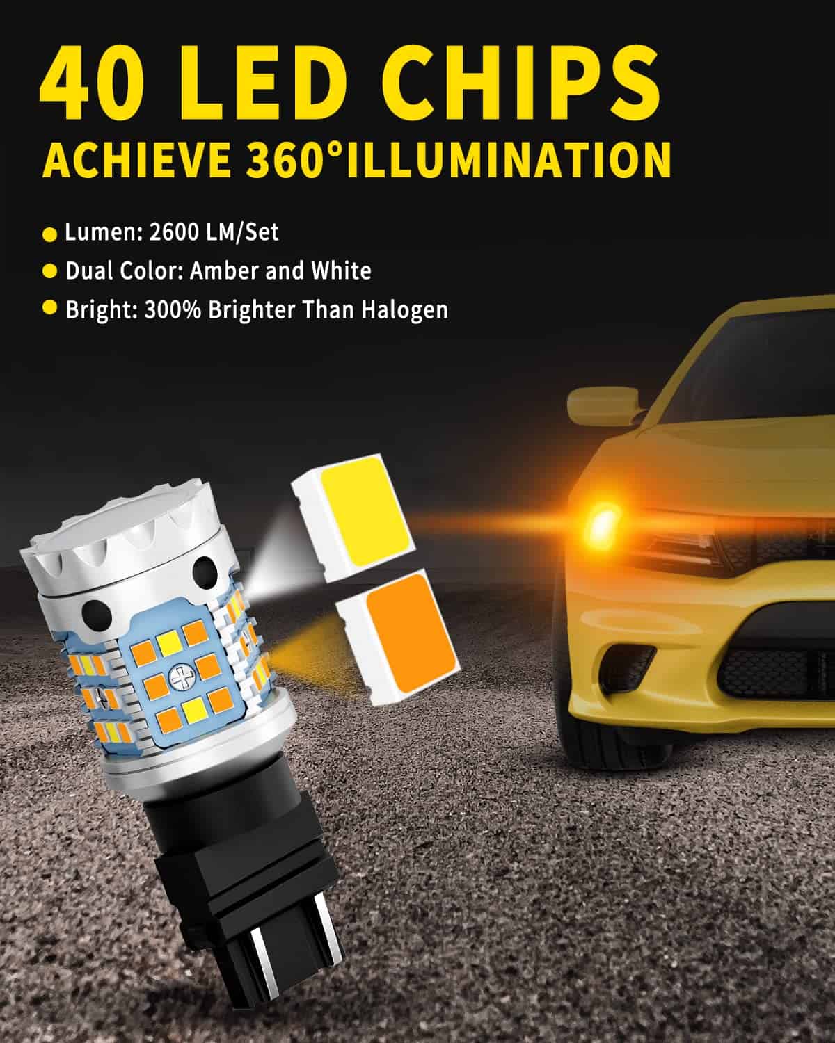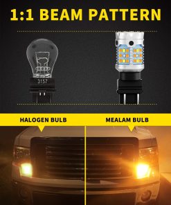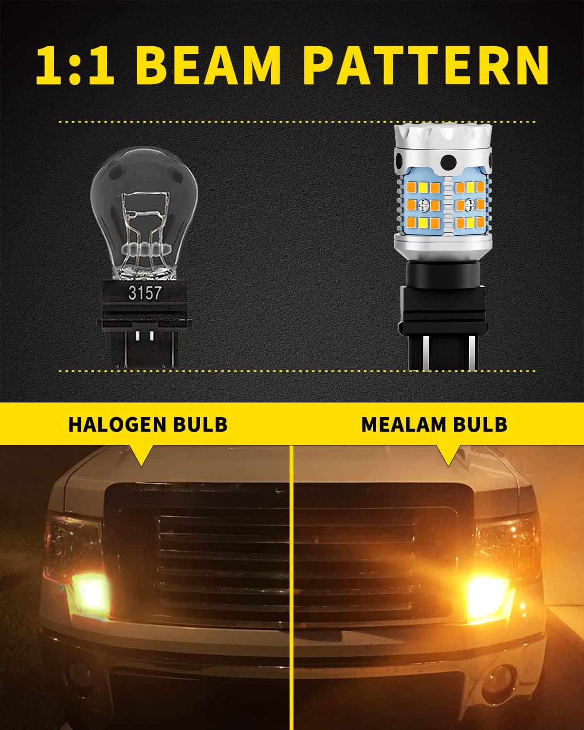 1. 300% Más brillante que los halógenos Cada bombilla LED intermitente MEALAM 3157 está equipada con 40 chips LED avanzados para lograr una iluminación de 360 grados, que proporciona un máximo de salida de luz y un 300% más brillante que la bombilla halógena original. Función de doble brillo, se ilumina de color ámbar para las señales de giro y de color blanco xenón para las luces de estacionamiento o luces diurnas.
