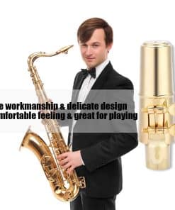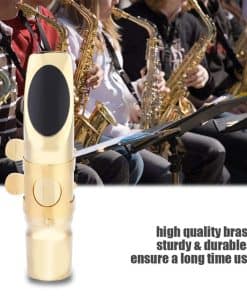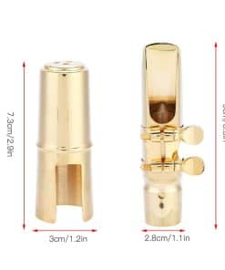 Especificaciones: Condición: 100% nuevo Material: Latón Peso: Aprox. 137g Tamaño de la boquilla: Aprox. 9 x 3cm Tamaño de la tapa: Aprox. 7.3 x 2.8cm Color: Dorado Lista de paquetes: 1 x Boquilla de Saxofón 1 x Tapa 2 x Almohadillas