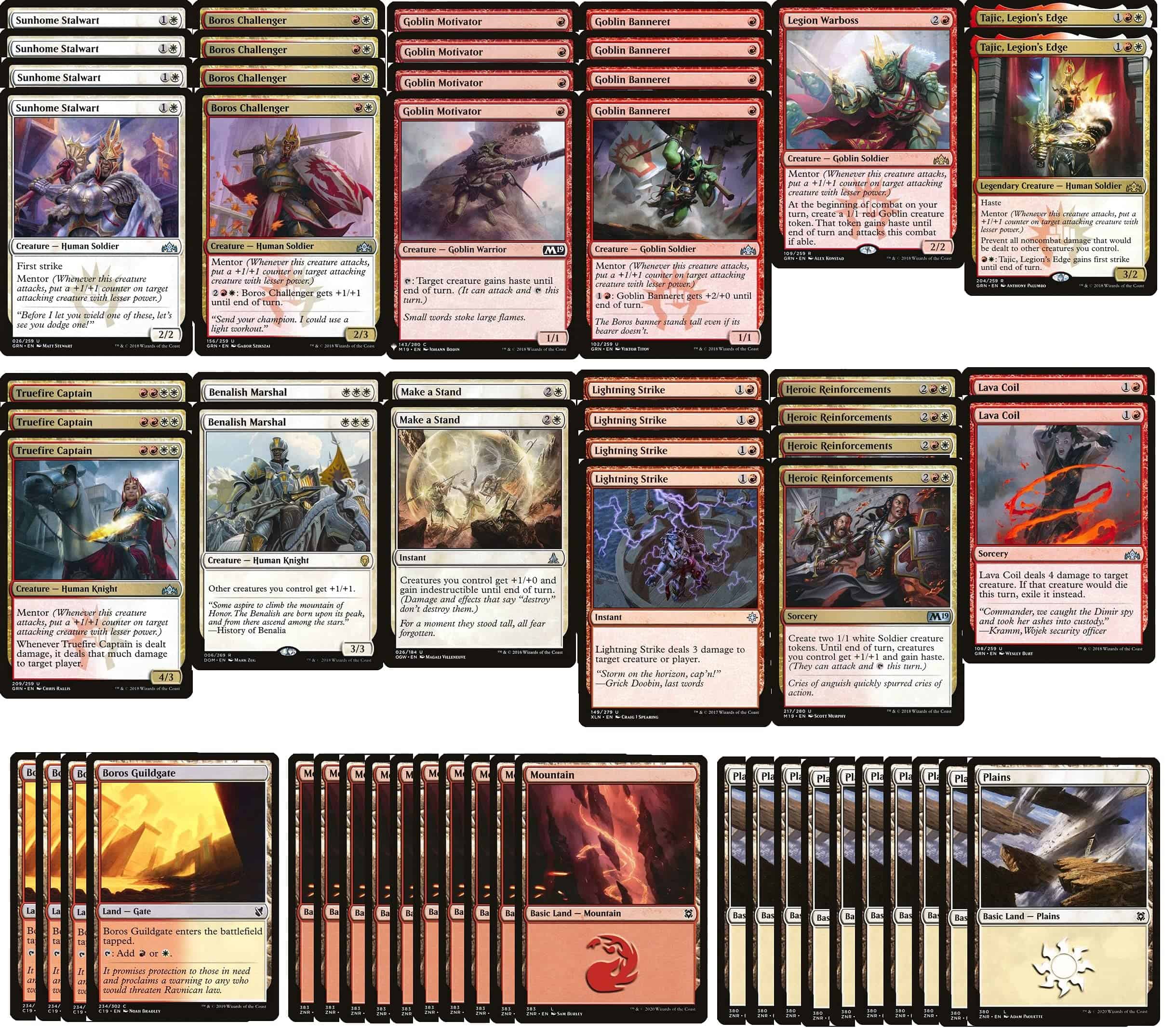 Este es un deck de 60 cartas, Boros Mentor. Este deck tiene como objetivo crear rápidamente un gran ejército de criaturas pequeñas, para luego hacer que las criaturas crezcan enormemente a través de la habilidad de mentor. El deck cuenta con 8 1-drop como Motivador Goblin y Estandarte Goblin para comenzar rápidamente, y luego agrega 2-drops con mentor incluyendo Estuardo de Solheim y Retador Boros. Criaturas poderosas como Cabecilla de la Legión, Tajic, Filo de la Legión y Mariscal Benalita se incluyen como 3-drops para completar tu curva agresiva. El deck luego agrega hechizos poderosos para ayudarte a acabar con tu oponente como Refuerzos Heroicos y Hacer Frente, así como eliminación eficiente en Golpe Relámpago y Espiral de Lava. Este deck comienza rápido y nunca deja de presionar, abrumando rápidamente a tu oponente. Este deck es PERFECTO para cualquiera que busque jugar con un deck temático nuevo y divertido. Este deck es notablemente poderoso y cuenta con varias criaturas y sinergias poderosas. Este deck ha sido probado y es notablemente fuerte, además de ser muy divertido de jugar.