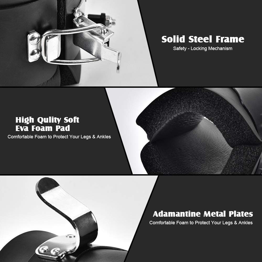 1. Material: Utiliza gancho de metal pesado, placa de acero de alta calidad de 2 mm. Puede soportar hasta 300 libras. Seguro y confiable. Forrado con espuma de 3 cm incorporada. Protege tu pantorrilla del contacto con la placa de acero externa. También actúa como antideslizante.