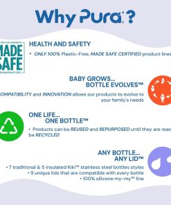 1. Pura se enfoca en la seguridad, durabilidad, facilidad de uso y consumo eco-progresivo. Nuestro diseño revolucionario no solo elimina los componentes de plástico, sino que también ofrece una funcionalidad mucho mejorada. Somos la primera y única línea de botellas juveniles libres de plástico que han logrado la calificación MADESAFE Certified. Además, nuestros sistemas One Life. One Bottle, que permiten que cualquier tapa se ajuste a cualquier botella en cada etapa de la vida, son una excelente manera de ayudar a salvar nuestro planeta y ayudar a librar nuestros océanos de desechos.