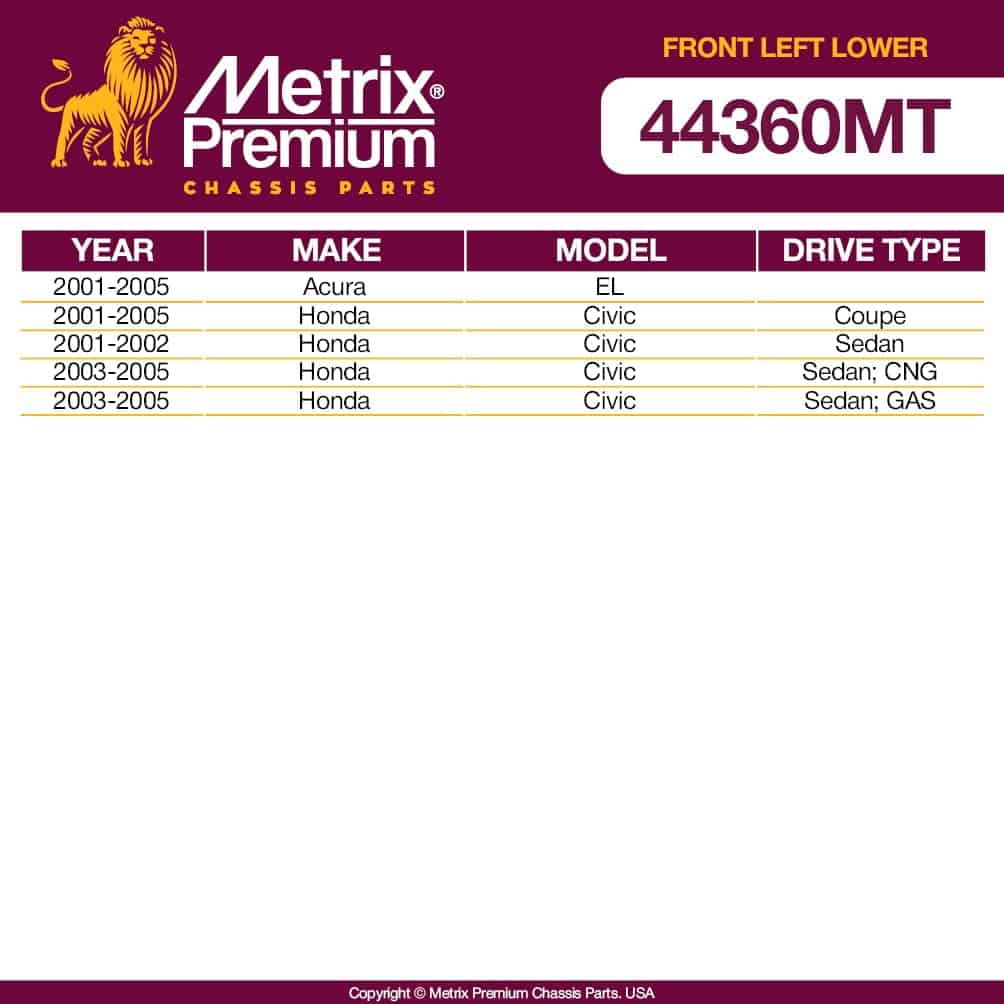 Diseñados de acuerdo con todos nuestros valores fundamentales, que es producir productos que coincidan o superen el rendimiento de calidad OEM, los Brazos de Control METRIX PREMIUM cumplirán todas tus expectativas al reemplazar piezas críticas de seguridad. Esta parte te proporcionará el ajuste a la primera vez que estás buscando. Una parte de calidad premium suministrada con todos los accesorios necesarios brindándote tranquilidad y un producto que te permitirá completar una instalación sin estrés.