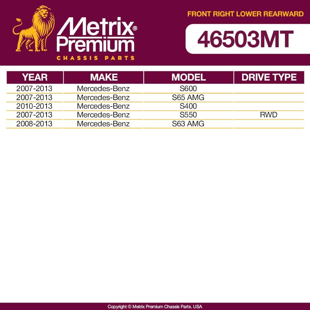 1. FUERTE Y DURADERO: Plateado por cataforesis para una protección adicional contra la corrosión de contaminantes como la sal, la suciedad o la entrada de agua. Suministrado en un resistente envase premium. 2. CALIDAD PREMIUM: Diseñado, probado y fabricado para cumplir o superar la calidad OEM. Sometido a rigurosas pruebas y fabricación estricta para garantizar un rendimiento óptimo. IATF 16949 ISO 9001. 3. INSTALACIÓN FÁCIL Y AJUSTE PERFECTO A LA PRIMERA: Se suministran todos los accesorios necesarios para garantizar un ajuste perfecto a la primera. 4. UNA MARCA EN LA QUE PUEDES CONFIAR: Calidad aprobada con un valor excepcional. Fabricado y diseñado en Turquía. Todas las piezas Premium Chassis de Metrix vienen con una Garantía Limitada de 3 años / 36,000 millas a partir de la fecha de instalación. 5. COMPATIBLE CON: Mercedes-Benz S600 2007-2013, Mercedes-Benz S65 AMG 2007-2013, Mercedes-Benz S400 2010-2013, Mercedes-Benz S550 RWD 2007-2013, Mercedes-Benz S63 AMG 2008-2013