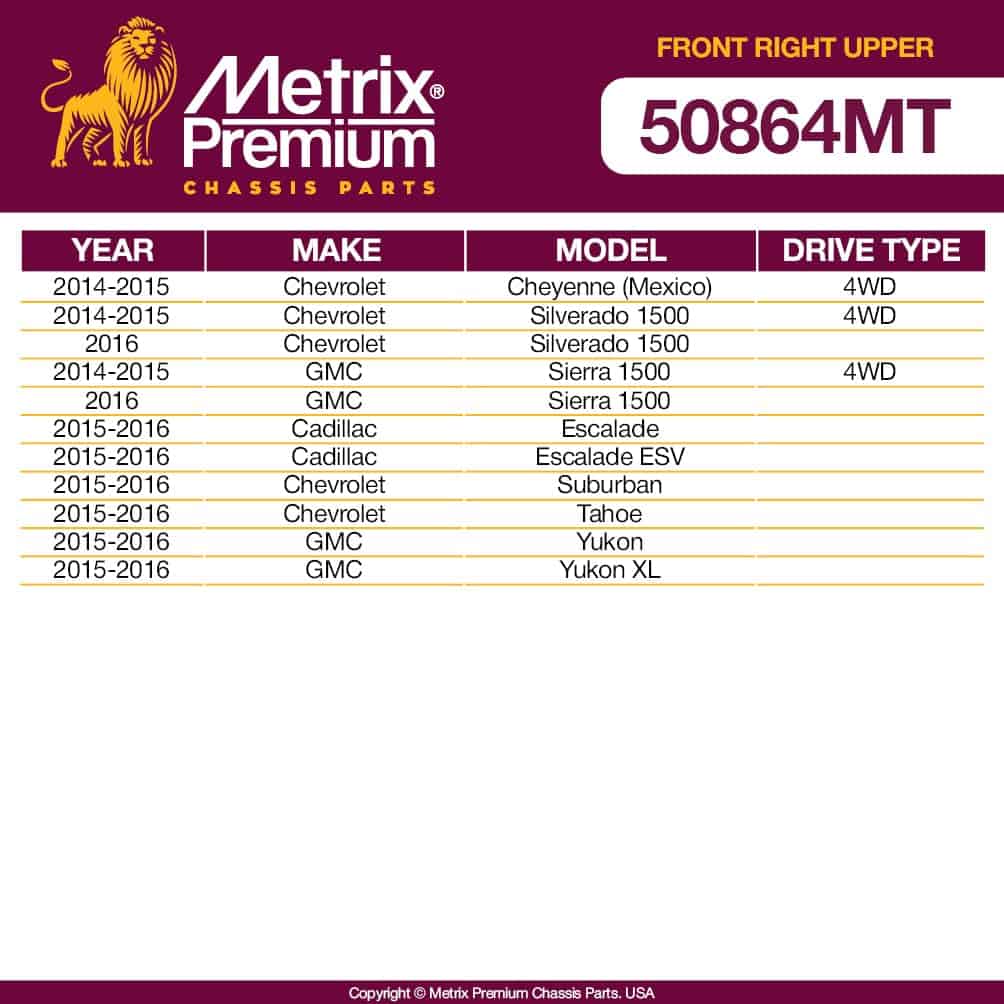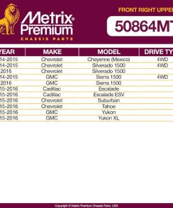 Brazo de control superior derecho delantero Metrix Premium RK623126 para Cadillac Escalade 15-20, ESV 15-20, Chevrolet Tahoe 15-20, Silverado 1500 LD 19 con Brazos de Aluminio. Hecho en Europa. Plateado por cataforesis para una protección adicional contra la corrosión por contaminantes como sal, suciedad o ingreso de agua. Suministrado en un empaque duradero premium. Diseñado, probado y fabricado para cumplir o superar la calidad OEM. Sometido a pruebas rigurosas y fabricación estricta para garantizar un rendimiento óptimo. IATF 16949 ISO 9001. Se suministran todos los accesorios requeridos para garantizar un ajuste perfecto a la primera. Calidad aprobada con un valor excepcional. Diseñado y fabricado en Turquía. Todas las piezas premium de chasis Metrix vienen con una garantía limitada de 3 años / 36,000 millas a partir de la fecha de instalación. Compatible con Chevrolet Cheyenne (México) 4WD 2014-2015, Chevrolet Silverado 1500 4WD 2014-2015, Chevrolet Silverado 1500 2016, GMC Sierra 1500 4WD 2014-2015, GMC Sierra 1500 2016, Cadillac Escalade 2015-2016, Cadillac Escalade ESV 2015-2016, Chevrolet Suburban 2015-2016, Chevrolet Tahoe 2015-2016, GMC Yukon 2015-2016, GMC Yukon XL 2015-2016 con Brazos de Aluminio