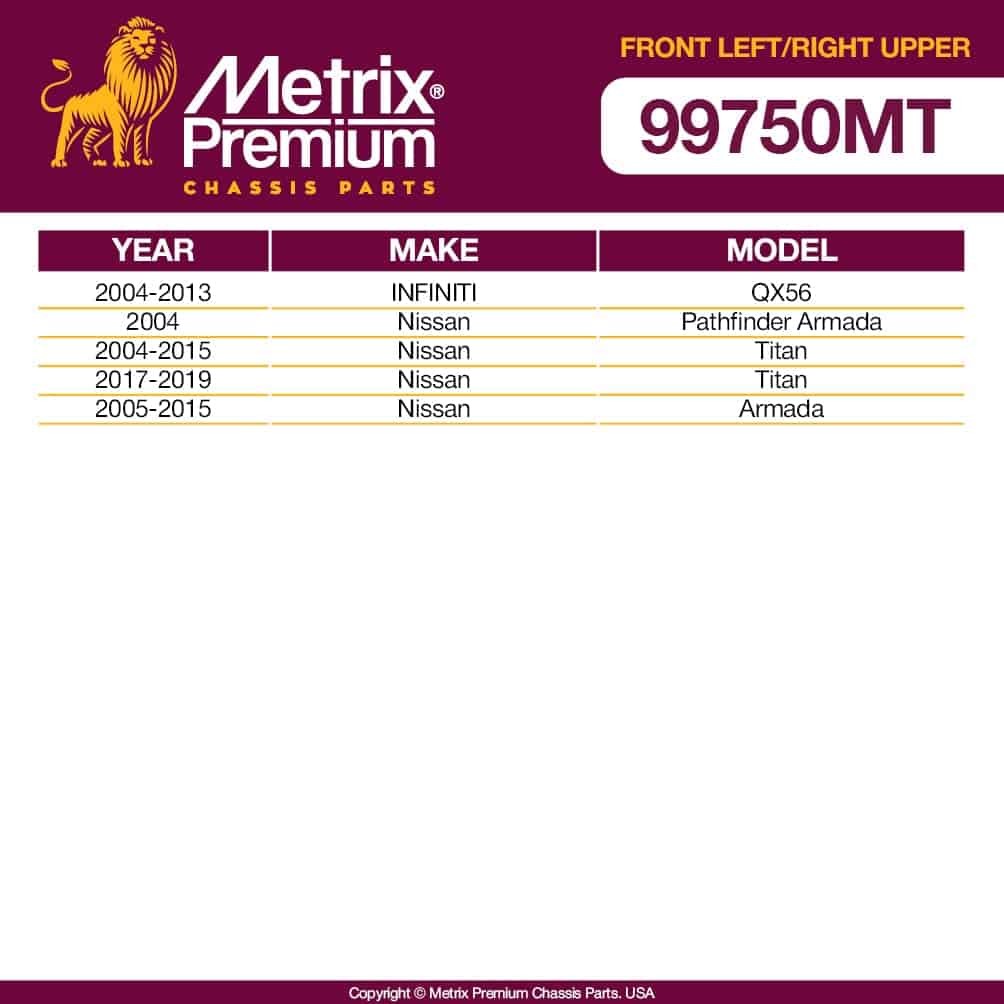 1. FUERTE Y DURADERO: Plateado por cataforesis para una protección adicional contra la corrosión y contaminantes como sal, suciedad o ingreso de agua. Se suministra en un empaque premium duradero. 2. CALIDAD PREMIUM: Diseñado, probado y fabricado para cumplir o superar la calidad OEM. Sometido a pruebas rigurosas y fabricación estricta para garantizar un rendimiento óptimo. IATF 16949 ISO 9001. 3. INSTALACIÓN FÁCIL Y AJUSTE PERFECTO A LA PRIMERA: Se suministran todos los accesorios necesarios para garantizar un ajuste perfecto a la primera. 4. UNA MARCA EN LA QUE PUEDES CONFIAR: Calidad aprobada con un valor excepcional. Diseñado y fabricado en Turquía. Todas las partes de chasis Metrix Premium tienen una garantía limitada de 3 años / 36,000 millas a partir de la fecha de instalación. 5. COMPATIBLE CON: 2004-2013 INFINITI QX56, 2004 Nissan Pathfinder Armada, 2004-2015 Nissan Titan, 2017-2019 Nissan Titan, 2005-2015 Nissan Armada