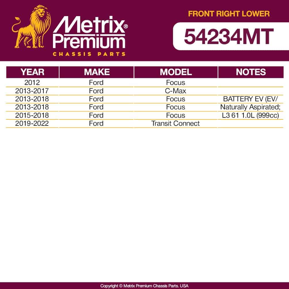 1. FUERTE Y DURADERO: Plateado cataforético para mayor protección contra la corrosión de contaminantes como sal, suciedad o ingreso de agua. Suministrado en un empaque premium duradero. 2. CALIDAD PREMIUM: Ingeniería, diseño, pruebas y fabricación para cumplir o superar la calidad OEM. Sometido a pruebas rigurosas y fabricación estricta para garantizar un rendimiento óptimo. IATF 16949 ISO 9001. 3. INSTALACIÓN FÁCIL Y AJUSTE PERFECTO A LA PRIMERA VEZ: Se suministran todos los accesorios requeridos para garantizar un ajuste perfecto la primera vez. 4. UNA MARCA EN LA QUE PUEDES CONFIAR: Calidad aprobada con un valor excepcional. Fabricado e ingeniería en Turquía. Todas las piezas Premium de Chasis Metrix vienen con una garantía limitada de 3 años / 36,000 millas a partir de la fecha de instalación. 5. COMPATIBLE CON: Ford Focus 2012 con brazos de control de aluminio, Ford C-Max 2013-2017, Ford Focus BATTERY EV (EV / BEV) 2013-2018 con brazos de control de aluminio, Ford Focus Naturalmente Aspirado; L4 122 2.0L (1999 cc) con brazos de control de aluminio, Ford Focus L3 61 1.0L (999 cc) 2015-2018 con brazos de control de aluminio, Ford Transit Connect 2019-2022 con brazos de control de aluminio