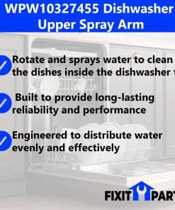 Revitalize el rendimiento de limpieza de su lavavajillas con el Brazo Rociador Superior WPW10327455. Este reemplazo esencial está diseñado para restaurar la eficiencia de su lavavajillas y asegurar que cada lavado deje sus platos impecablemente limpios. Fabricado con materiales duraderos, cada brazo rociador está construido para durar, brindándole un rendimiento confiable durante años. El kit es compatible con una variedad de modelos de lavavajillas, convirtiéndolo en una solución versátil para sus necesidades de reparación de electrodomésticos. ¡La instalación es sencilla! Con instrucciones claras proporcionadas, puede reemplazar los viejos brazos rociadores en poco tiempo, eliminando la molestia de costosas llamadas de servicio. Experimente una potencia de limpieza mejorada a medida que estos brazos rociadores trabajan juntos para ofrecer una distribución de agua uniforme para obtener resultados de limpieza óptimos. No permita que los brazos rociadores desgastados comprometan su experiencia de lavado de platos. ¡Actualice su lavavajillas hoy con este kit completo de brazo rociador y disfrute de platos impecables después de cada ciclo!