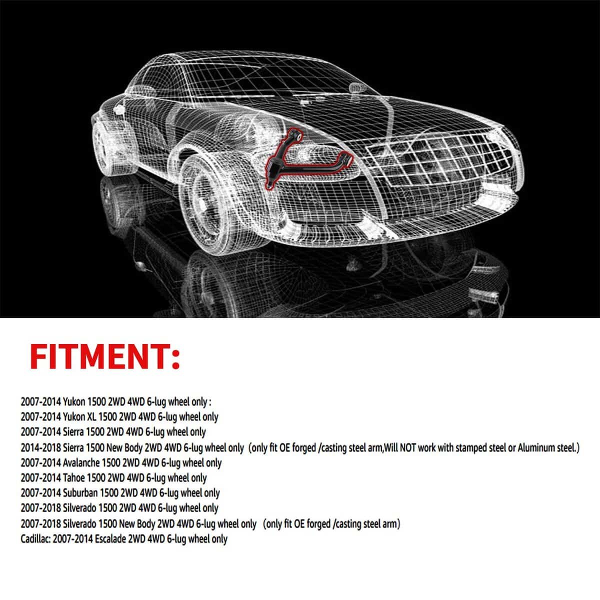 2014-2018 Sierra 1500 Nuevo Cuerpo 2WD 4WD solo compatible con brazos de acero forjado / fundido OE, NO funcionará con acero estampado o Aluminio.