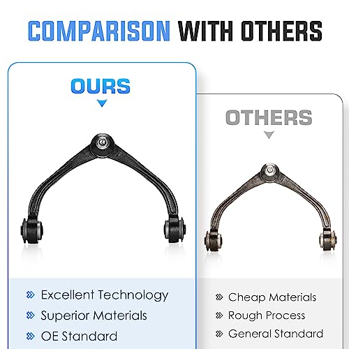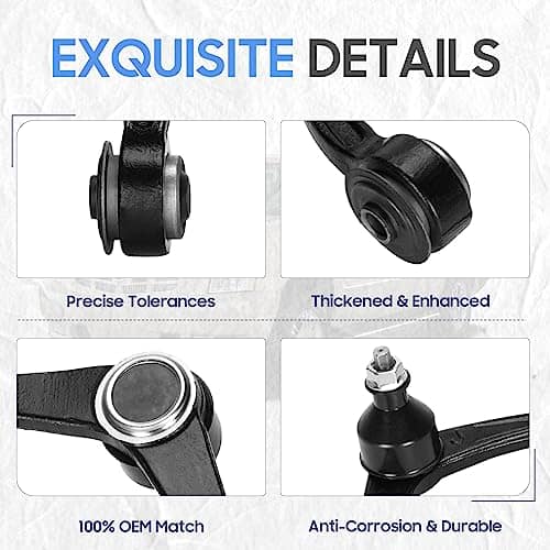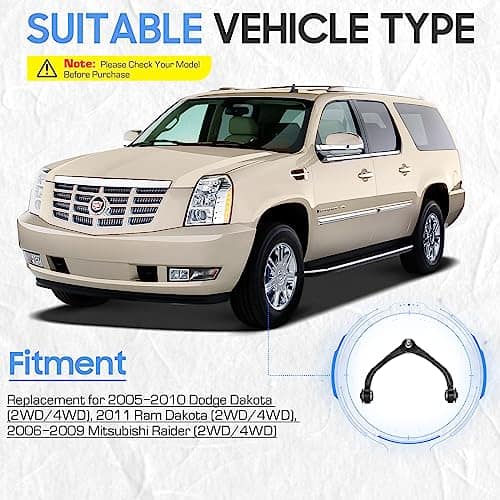 Kit de reemplazo perfecto para Dodge Dakota 2005-2010 (2WD/4WD), Ram Dakota 2011 (2WD/4WD), y Mitsubishi Raider 2006-2009 (2WD/4WD). Construido con material de alta calidad y sometido a múltiples pruebas para garantizar calidad y durabilidad. Reemplazo directo para el equipo original para prolongar la vida de tu vehículo. Tolerancias de precisión para una fácil instalación en todas las partes. Los brazos de control superiores delanteros tienen alineación de dirección que garantiza un trabajo perfecto. Antes de realizar el pedido, consulta el modelo de tu vehículo en el Sistema de Filtro de Ajuste de el fabricante en la esquina superior izquierda.