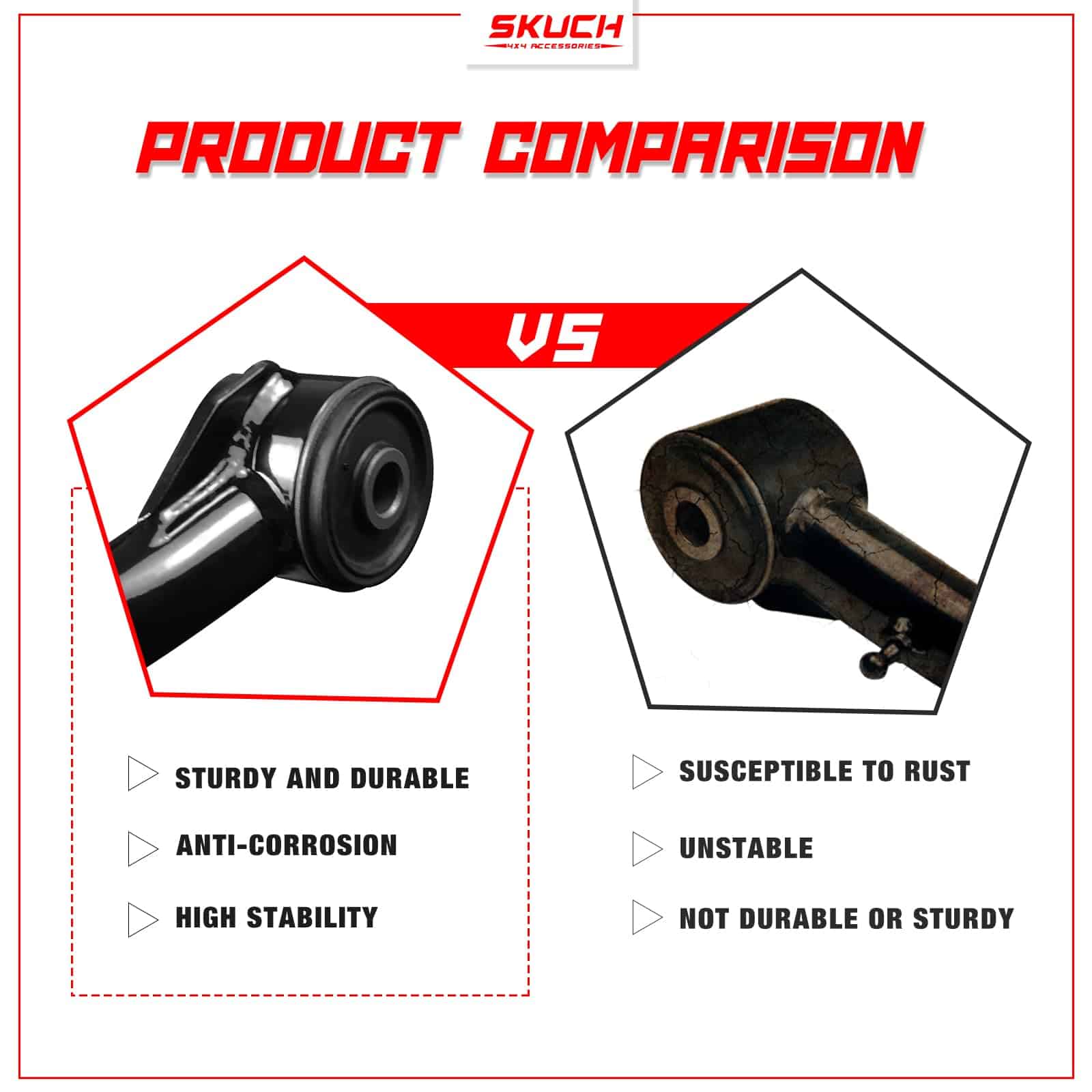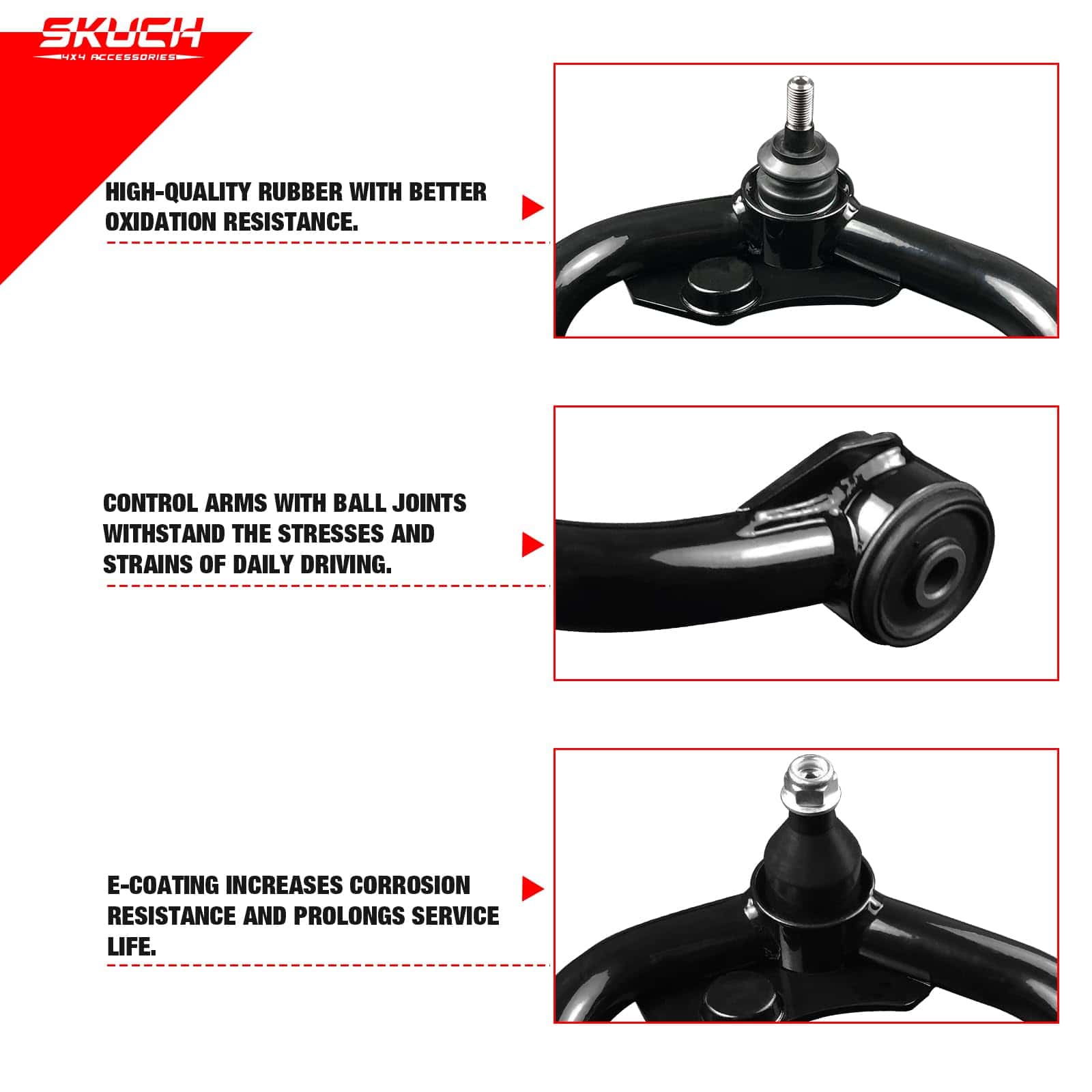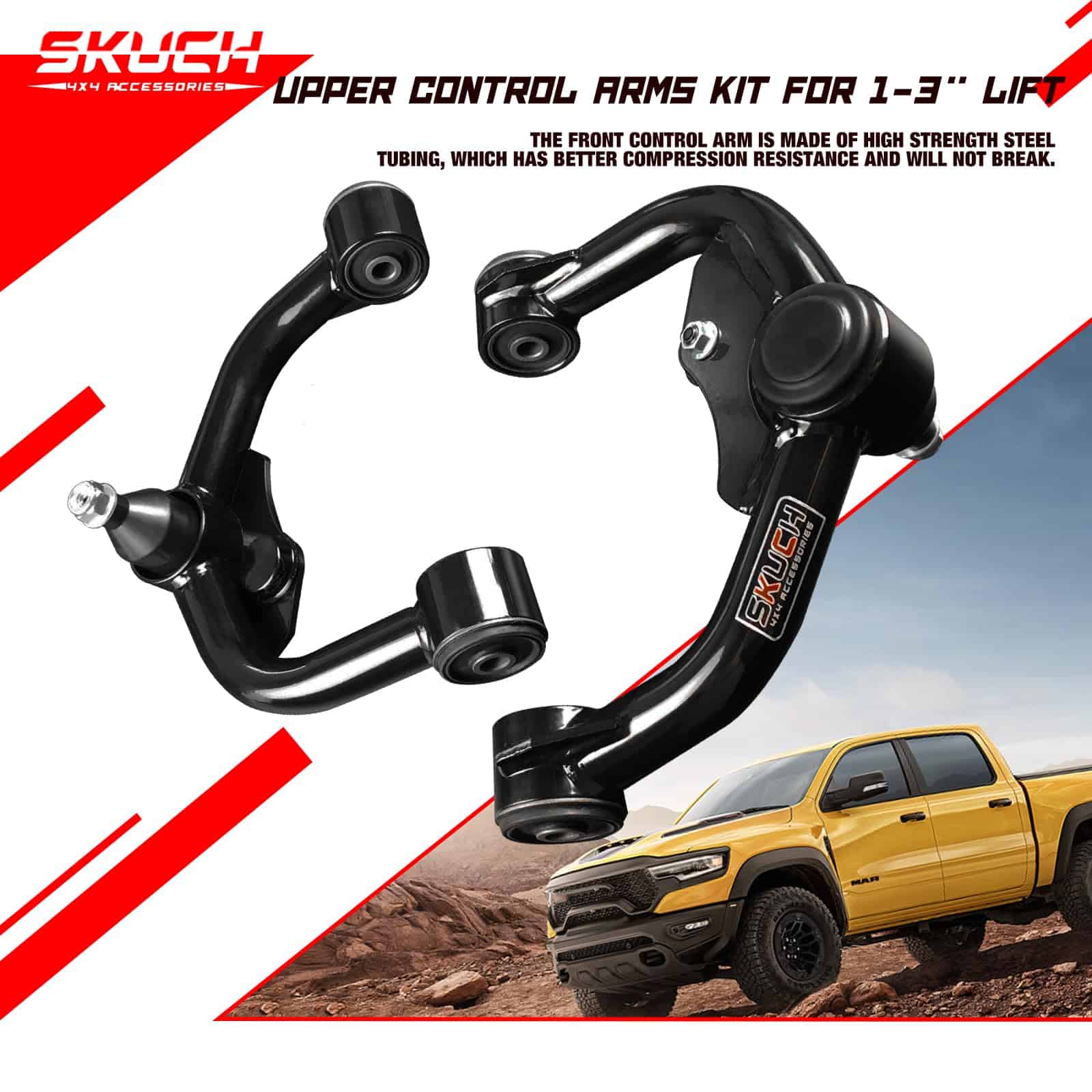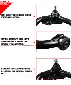 — Los brazos de control superiores delanteros están hechos de acero de alta resistencia con robustos soportes de montaje para una durabilidad robusta. El recubrimiento negro prolonga la vida útil y evita la oxidación.