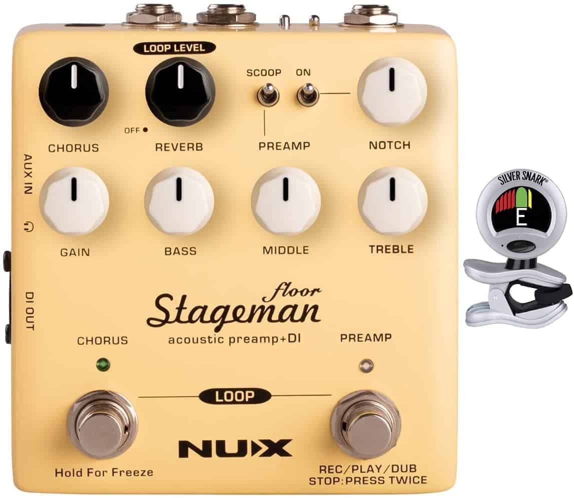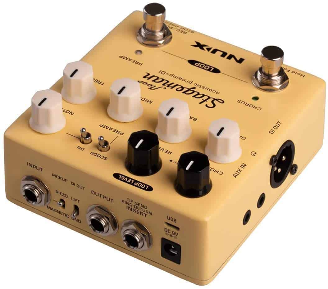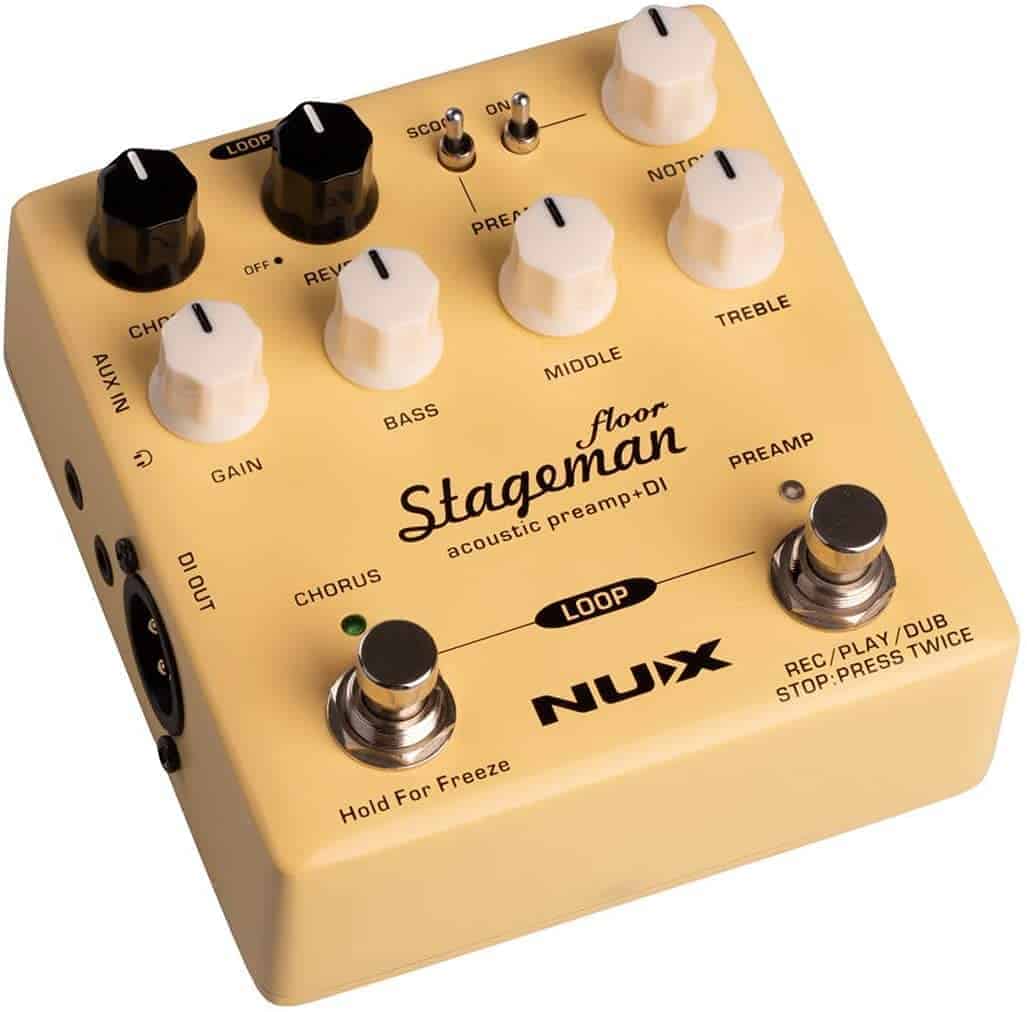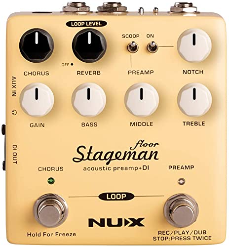 Mayor Claridad, Control de un Solo Botón Efectos de Alta Calidad Mayor claridad NUX Stageman Floor es un preamplificador acústico analógico con efectos digitales y función de looper. El preamplificador cuenta con un EQ de 3 bandas altamente sensible con interruptor de corte MID, filtro de muesca ajustable y control de ganancia de entrada. Y proporciona una gran cantidad de margen de maniobra que ofrece un sonido completamente natural. Control de un Solo Botón Efectos de Alta Calidad Está equipado con efectos de Reverb y Chorus, y cada efecto está diseñado para controlarse con un solo botón, al ajustar la perilla de chorus o reverb de 0 a 10 se ajustan múltiples parámetros con un equilibrio perfecto. Y el interruptor de chorus es un pedal momentáneo, al presionar y mantenerlo, activará el efecto de congelación hasta que lo sueltes. Filtro de Muesca Puedes activar el filtro de muesca y ajustar la frecuencia para limpiar el sonido de la muesca causado por una púa de guitarra o uñas.