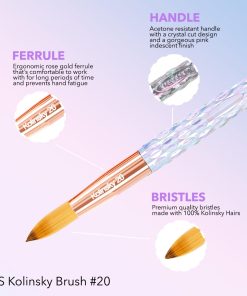 La brocha de acrílico Kiara Sky #8 es una herramienta de alta calidad diseñada para profesionales de uñas. Hecha de 100% pelo de Kolinsky puro, esta brocha ofrece precisión y suavidad en cada aplicación. El mango Crystal Cut brinda comodidad ergonómica, mientras que su resistencia al acetona la hace duradera y confiable. ¡Obtén resultados impecables con la brocha de acrílico Kiara Sky!