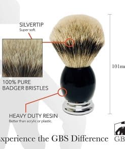 La Brocha de Afeitar G.B.S de pelo de tejón plateado 100% puro exfolia suavemente la piel para ayudar a liberar los pelos atrapados. Negra resistente con punta de cromo, alta densidad de cerdas viene con un soporte para cepillo que ayuda a que su brocha de afeitar se seque correctamente. El cepillo de tejón es extremadamente suave, eficiente en la absorción de agua y retención de calor. Definitivamente debes agregarlo a tu kit de afeitado, seguramente mejorará el aspecto de tus elementos esenciales de afeitado al siguiente nivel. El cepillo de tejón tiene un mango de resina de alta calidad que te ayuda a tener un agarre perfecto mientras te afeitas. Siempre brindamos el mejor servicio al cliente para poner una sonrisa en tu rostro. Todos nuestros cepillos crean espuma rica y espesa. Los cepillos están hechos con pelo de tejón plateado 100% puro y se deslizan sin esfuerzo con crema de afeitar o jabón de afeitar. Es una excelente elección para uso diario, viajes o regalos, entre otros. Nuestros cepillos son convenientes y duraderos para usar.