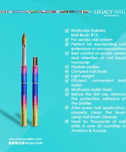 Brocha de uñas multicolor Kolinsky #12, perfecta para esculpir extensiones de uñas o encapsulaciones, desarrollada para obtener el mejor control de perlas acrílicas y retención de monómero líquido para uñas. Esta brocha tiene un hermoso y moderno aspecto multicolor, y también incluye una tapa para proteger sus cerdas.