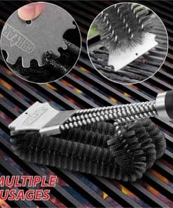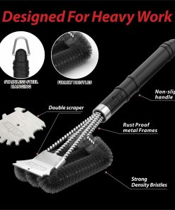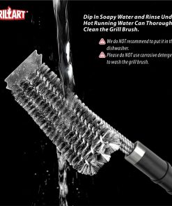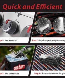 Brocha y raspador para parrilla Grillart de 18 pulgadas es el accesorio perfecto para mantener tus parrillas limpias y relucientes. Con una brocha de 3 en 1, un rascador doble y un mango antideslizante de 18 pulgadas, esta herramienta te ofrece una limpieza eficiente y rápida de tus parrillas. El rascador ancho ayuda a eliminar los residuos grasientos difíciles de limpiar, mientras que las cerdas gruesas y los rascadores dobles limpian un área más grande con una sola pasada. El mango largo y resistente garantiza un agarre cómodo y una distancia segura del calor. Construido para durar, este conjunto de brocha y raspador de acero inoxidable premium nunca se oxida y puede durar años sin deformaciones ni roturas. No olvides que todas las brochas de parrilla se desgastan con el tiempo, por lo que es importante limpiar las parrillas con un paño húmedo después de usarlo para evitar que las cerdas queden atrapadas.