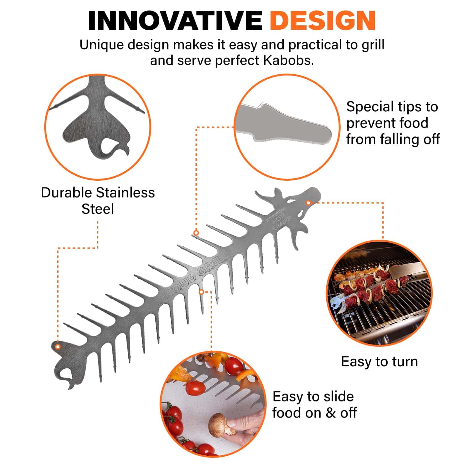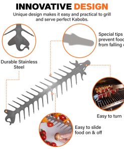 1. DISEÑO INNOVADOR – La comida se desliza fácilmente en y fuera de cada tallo plano. Estas brochetas de metal cuentan con puntas especiales para evitar que la comida se caiga. Dos motivos de cabeza únicos en las brochetas de la parrilla.