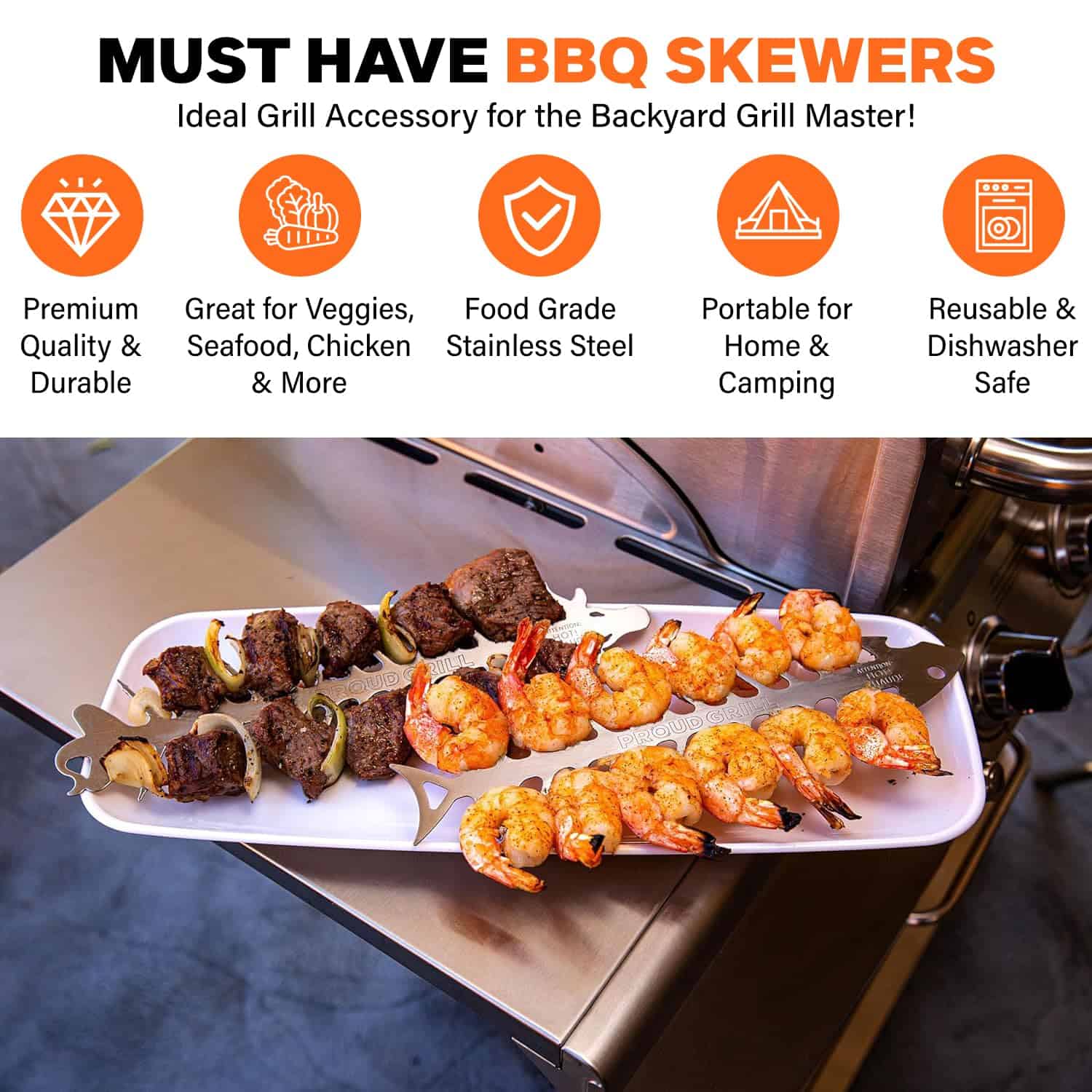 3. ACCESORIO DE PARRILLA IDEAL – Las puntas de las brochetas y el diseño evitan que la carne y las verduras se den vuelta en la parrilla para una cocción más pareja. El diseño de la cabeza permite que las pinchos de barbacoa de acero inoxidable sean fácilmente volteadas en la parrilla con pinzas.