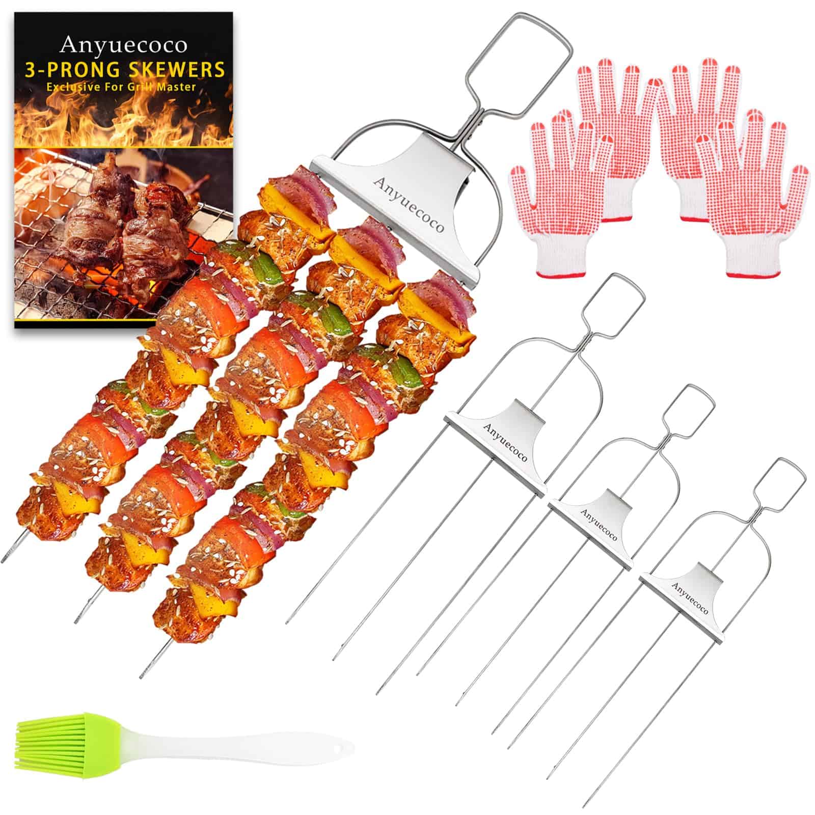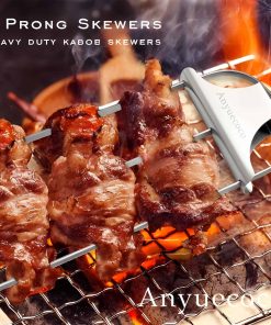 3. Herramienta de Barbacoa Profesional : Comparado con otras brochetas de barbacoa con una o dos puntas, las brochetas de barbacoa de 3 puntas permiten agregar más variedades y cantidades de alimentos a la parrilla. Al voltear la comida, se pueden voltear más piezas a la vez, lo que resulta en un calentamiento más uniforme y evita que se queme. Esto facilita y simplifica la barbacoa.