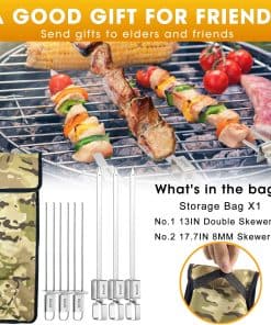 6 piezas de brochetas de acero inoxidable de alta calidad 304 SUS, resistentes al óxido y duraderas. Diseñadas con un asa de anillo grande y un deslizador corto para empujar fácilmente vegetales y carne. Incluye brochetas dobles para una mayor estabilidad de los alimentos y brochetas de 17.7″ de largo para alimentos pequeños y finamente asados. Adecuadas para todo tipo de parrillas y ocasiones, con una bolsa de almacenamiento de tela Oxford para un fácil transporte. Servicio de satisfacción garantizado para una experiencia sin problemas y satisfactoria.