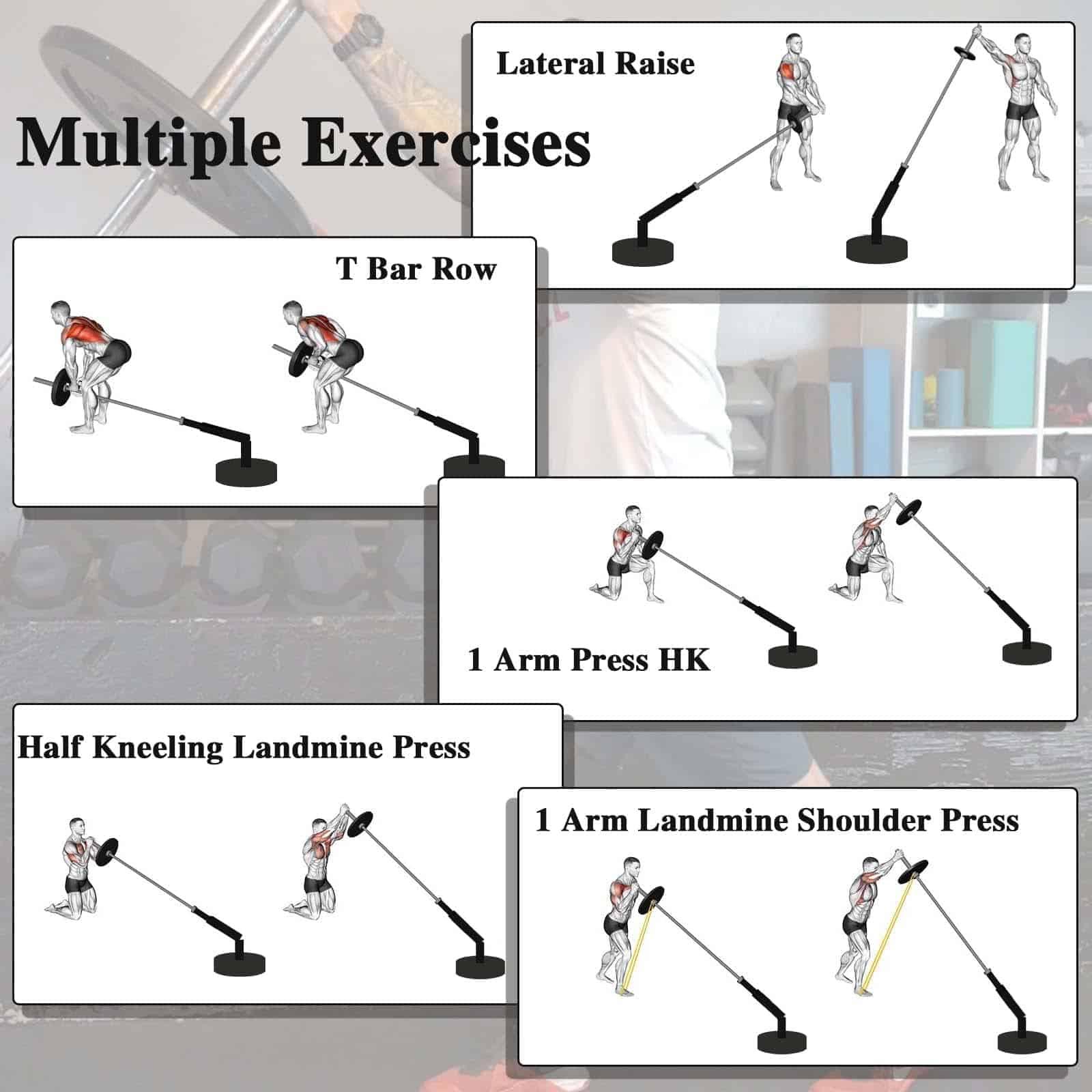 5. Múltiples ejercicios: La característica de rotación de 360 grados permite realizar varios ejercicios como prensa de hombros arrodillado, estocada lateral, press de landmine, sentadilla elevada, etc.