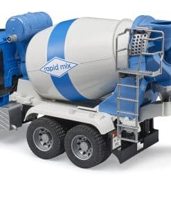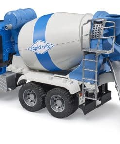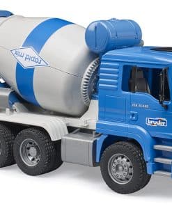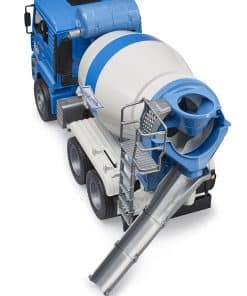 Este camión se basa en el conocido y probado MAN TGA. Su cabina se puede inclinar y ofrece una vista del bloque del motor. Gira el tambor mezclador del camión modernizado utilizando una manivela instalada en el tanque de agua. El tambor cuenta con una espiral y mezclador y, al igual que el original, el tambor se vacía invirtiendo su dirección de rotación. La espiral en el interior del tambor transporta la carga hacia la canaleta de descarga en la parte trasera. Incluye dos canaletas de desagüe enchufables. Una figura bworld puede controlar las funciones del mezclador subiendo por las escaleras adjuntas.