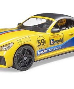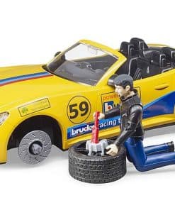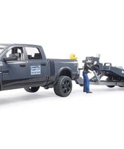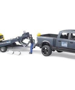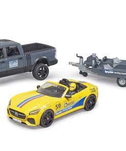 Tanto jóvenes como mayores se sienten fascinados por el automovilismo. No es de sorprenderse con estos niveles de emoción, adrenalina y rápidos autos deportivos. Bruder tampoco es inmune a esta fascinación. Con el Ram Power Wagon que incluye el sintonizado equipo de carreras Bruder, hay un nuevo y emocionante vehículo y remolque para la temática de ocio mundial. El Ram Power Wagon está lleno de potencia con una potencia de hasta 410 HP y tracción en las cuatro ruedas para llevar el auto de carreras al circuito con facilidad. Las cuatro puertas de esta camioneta se abren y la probada extensión del volante facilita la maniobrabilidad del vehículo. El remolque de transporte cuenta con una plataforma basculante, calzos para ruedas y un cabrestante para transportar y cargar el vehículo de forma segura. El roadster cuenta con un techo desmontable a través del cual se puede colocar al piloto de carreras encerrado detrás del volante. El auto deportivo ha sido equipado con el nuevo sistema de cambio de ruedas de Bruder. Hemos incluido una gran hoja de calcomanías con muchas opciones para que los jóvenes pilotos de carreras diseñen su auto de forma individualmente.