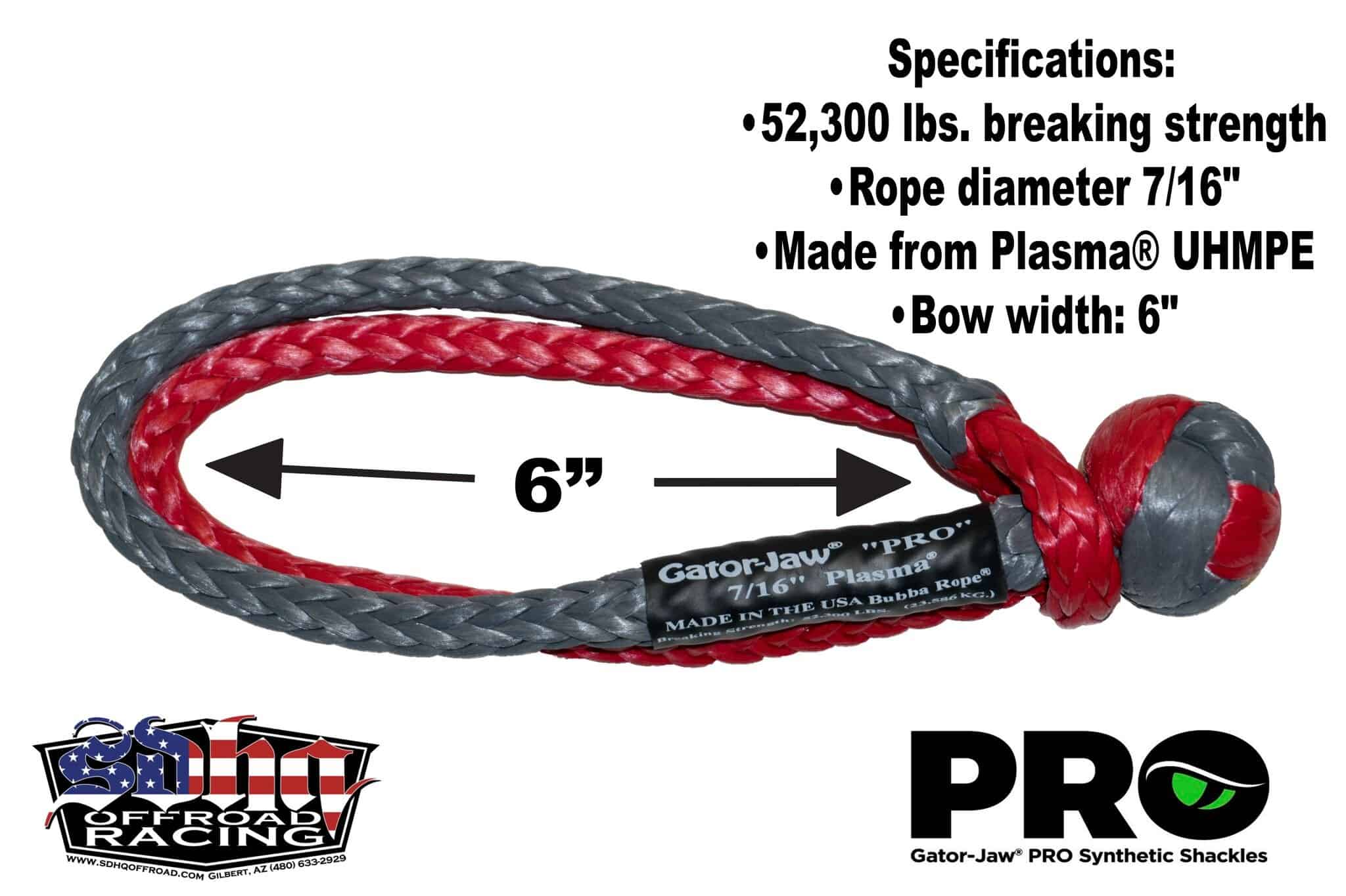 Todos los grilletes sintéticos Gator-Jaw se utilizan como alternativa a los pesados grilletes o ganchos de acero para conexiones más ligeras, seguras y fáciles. Los grilletes sintéticos Gator-Jaw se utilizan tanto recreativamente como comercialmente para remolcar, recuperar vehículos o equipos y diversos usos marinos. Los grilletes sintéticos Gator-Jaw derivan su resistencia básica de la utilización de cuerda de plasma, que es la cuerda sintética de mayor resistencia disponible. El nuevo grillete sintético de la serie Gator-Jaw PRO de 7/16 pesa solo 6.5 onzas pero tiene una resistencia a la rotura de 52,300 lbs. Debido a que todos los grilletes sintéticos Gator-Jaw no contienen acero, no se oxidarán y son tan ligeros que flotan. Estamos muy emocionados con esta nueva serie Gator-Jaw PRO, dijo Jim Grass, el nuevo gerente de productos de Bubba Rope.