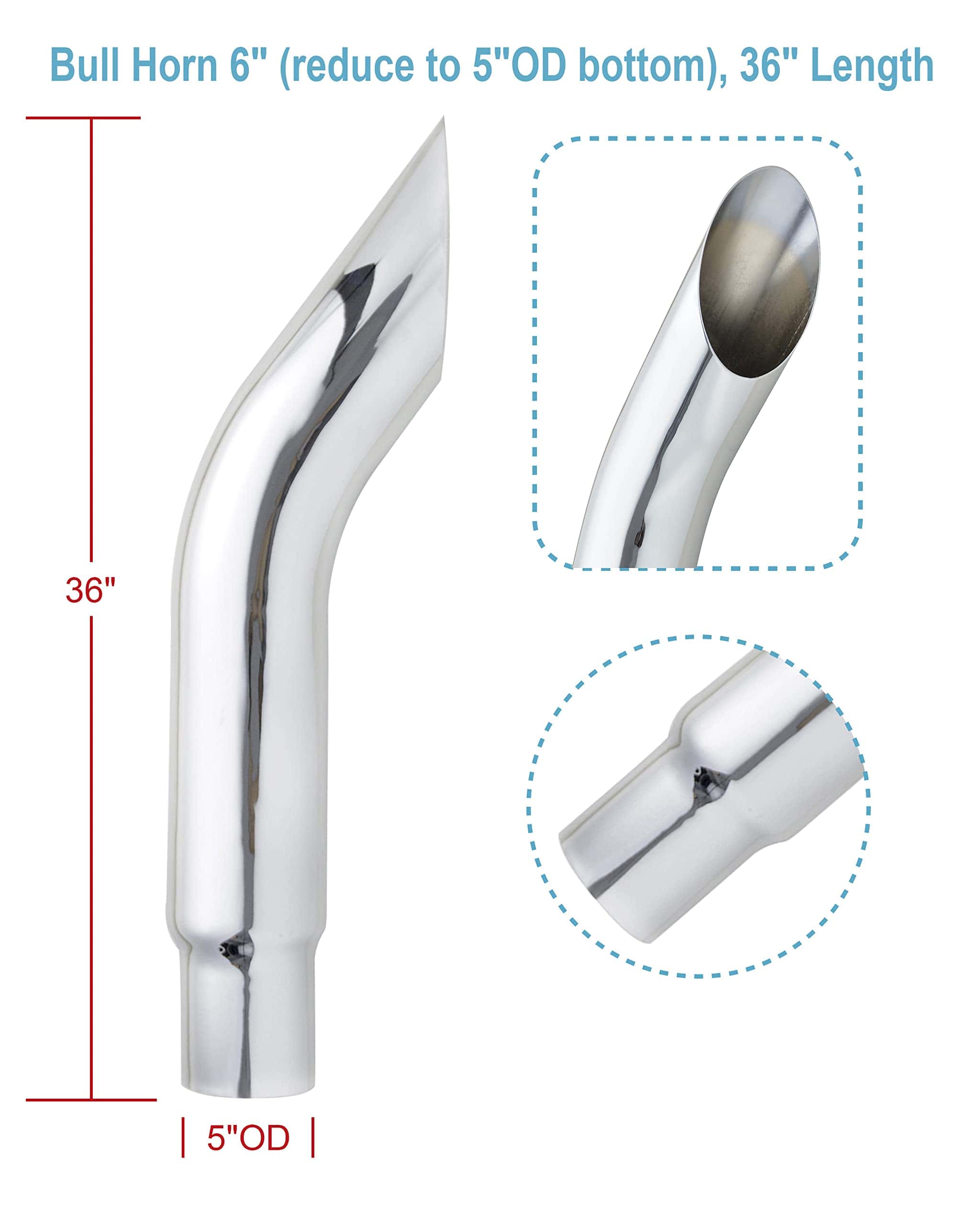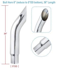 Bull Horn de Cromo de 6 pulgadas (reduce a 5 pulgadas de OD), longitud de 36 pulgadas. Esta pieza de calidad está recubierta con cromo para mayor durabilidad y confiabilidad en diferentes condiciones climáticas. Con una apertura de «Cuerno de Toro», este tubo de 6 pulgadas se reduce a 5 pulgadas para facilitar la instalación final. Se vende por unidad.