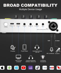 4. Gran Compatibilidad: Este bundle de equipo de podcast es compatible con PC, tablet, portátil y teléfono. Plug and play sin necesidad de controladores. Soporta la conexión a dos teléfonos móviles y dos micrófonos para hacer streaming en ambas plataformas simultáneamente. También es compatible con Windows, iOS, Android y Mac OS, pudiendo ser utilizado en numerosas aplicaciones de audio y dispositivos de entretenimiento, como OBS, iMovie, PS4/5, Xbox, etc. para juegos, streaming en vivo y grabación.