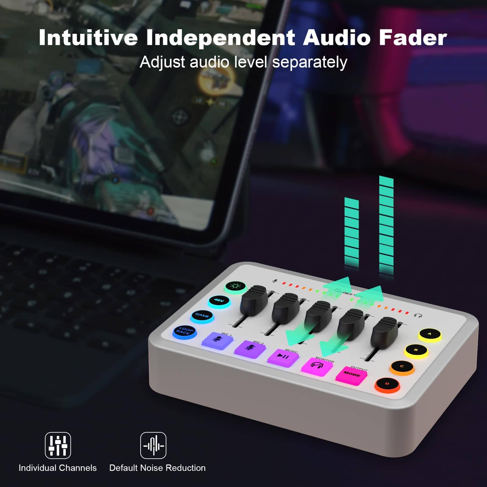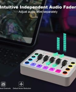 1. Características de audio: El mezclador de streaming cuenta con 5 ajustes de volumen independientes, 4 botones personalizados, 6 cambios de voz, lo que te permite dar forma al audio según tus preferencias y hacer que tu grabación sea animada e interesante. Los controles intuitivos son útiles para gestionar varios audios y facilitan la configuración al hacer podcasts, mejorando la eficiencia de la edición de audio de tus emisiones.