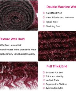 Bundles de Cabello Humano Ondulado Profundo en Color Vino Rojo, 3 Bundles de 20 Pulgadas, 22 Pulgadas, y 24 Pulgadas. Cada Bundle contiene 50 Gramos de Cabello 100% Humano sin Procesar. Doble trama para mayor durabilidad y grosor. Extensión de Cabello Humano de calidad Brazileña sin tratar. Ofrece un hermoso aspecto ondulado profundo y natural. Perfecto para un cambio de estilo o una nueva apariencia. Consigue un cabello hermoso y elegante con estos Bundles de Cabello Humano de alta calidad.