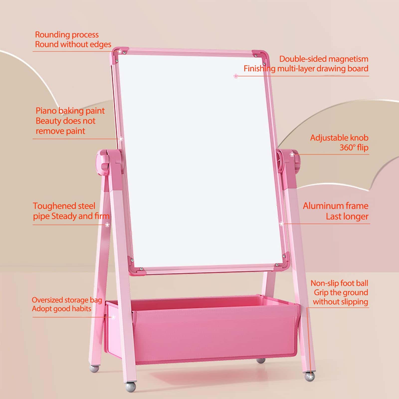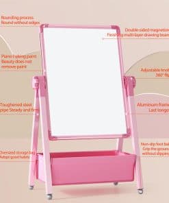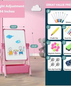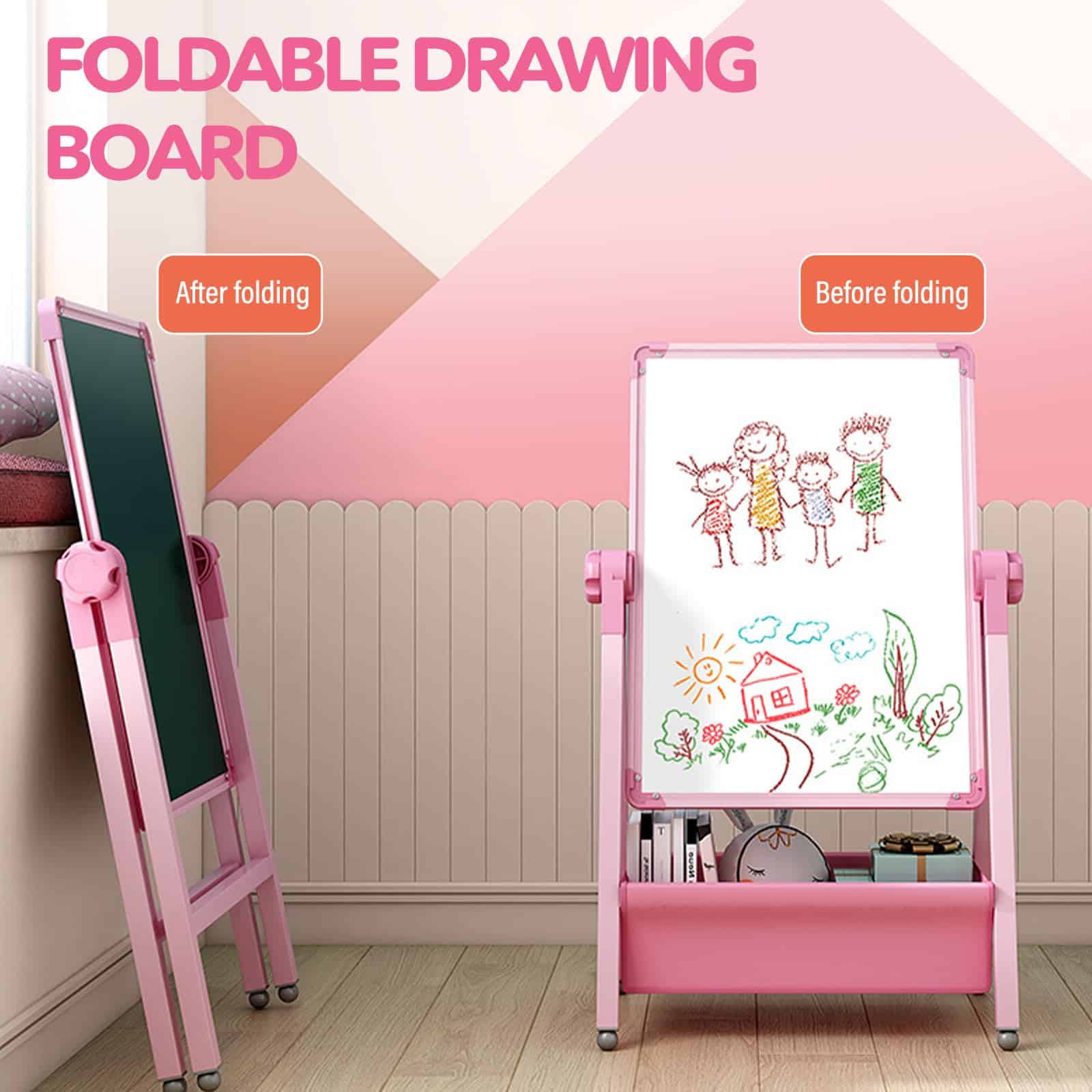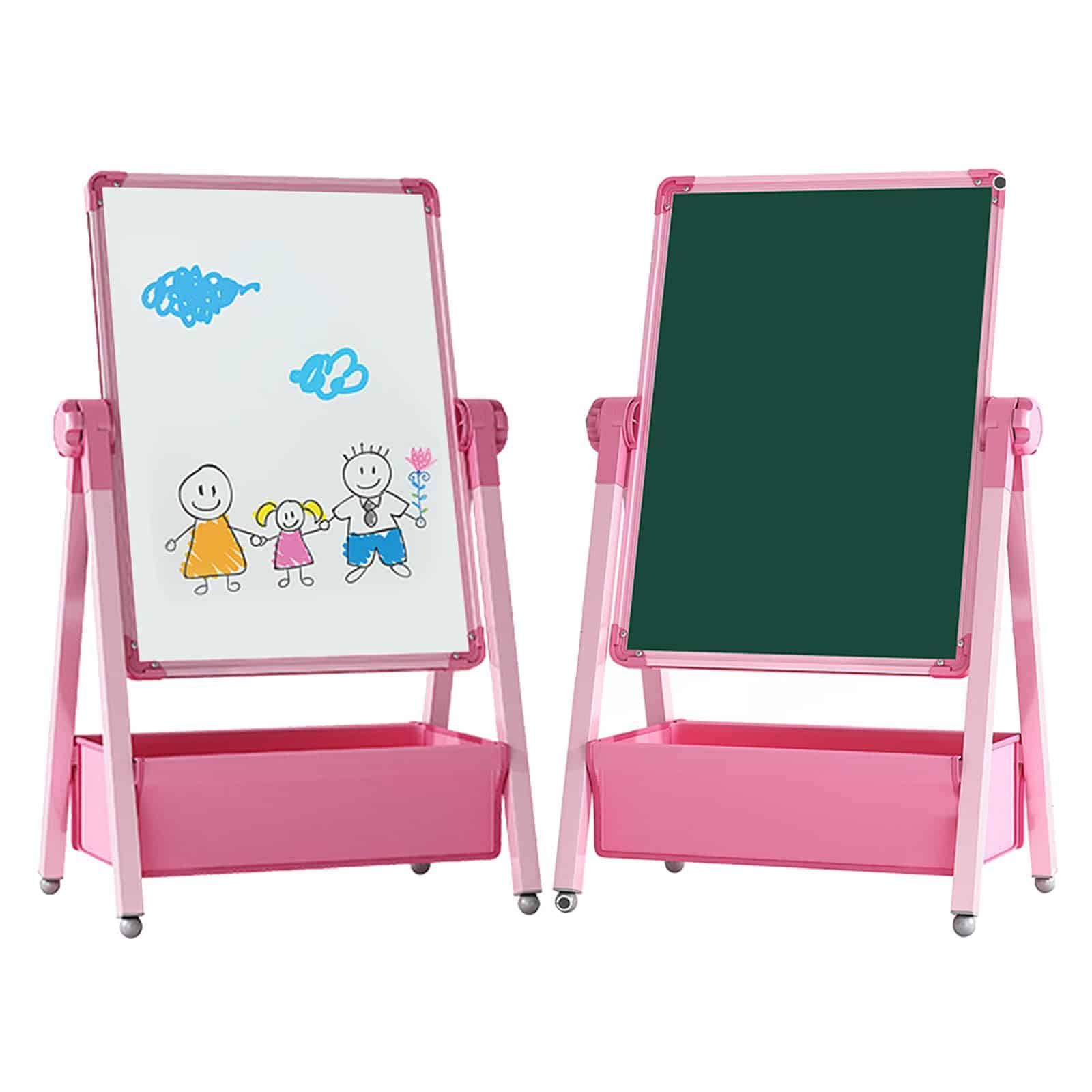 TODOS LOS ACCESORIOS: 1 caballete de arte para niños 8 bolígrafos de pizarra blanca 1 tiza sin polvo 1 estuche para tiza 1 borrador de pizarra 4 bolas de pie antideslizantes 8 hebilla magnética 1 toalla de alta calidad CARACTERÍSTICAS: Doble cara/ Escritura fluida/ Ajuste de altura/ Rotación libre de 360 grados con fijación