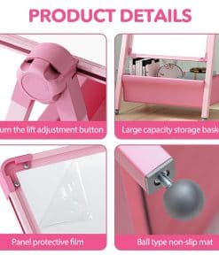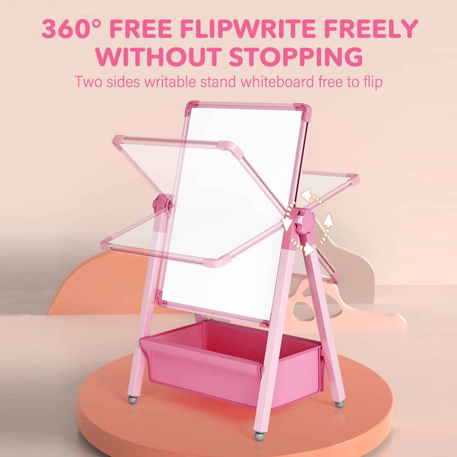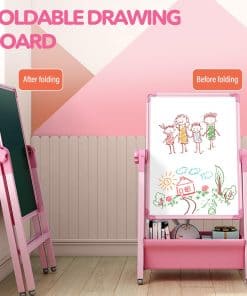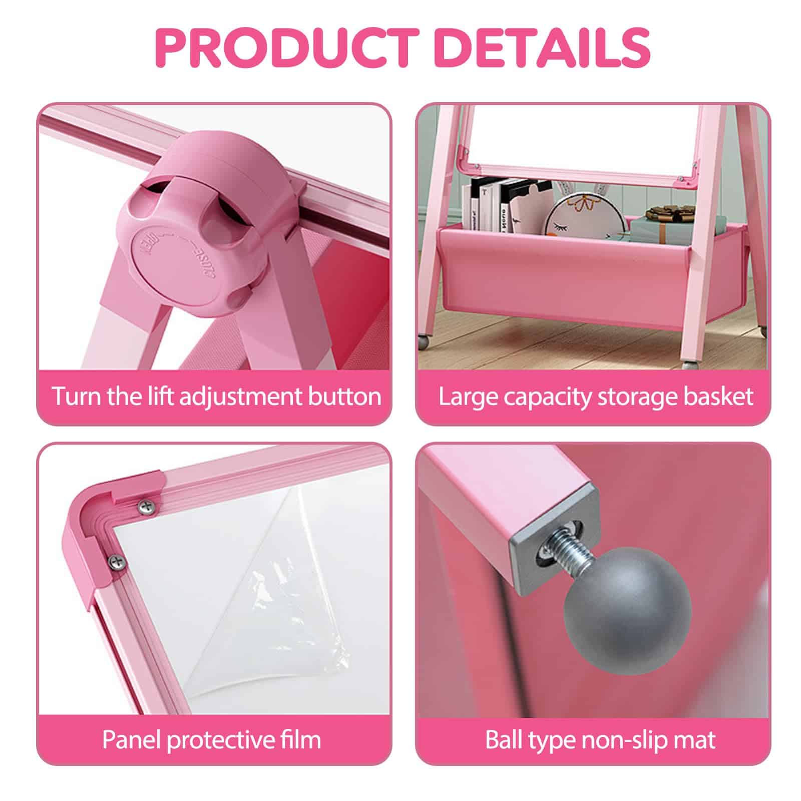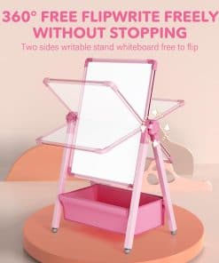 TODOS LOS ACCESORIOS: 1 caballete de arte para niños 8 bolígrafos de pizarra blanca 1 tiza sin polvo 1 estuche para tiza 1 borrador de pizarra 4 bolas de pie antideslizantes 8 hebilla magnética 1 toalla de alta calidad CARACTERÍSTICAS: Doble cara/ Escritura fluida/ Ajuste de altura/ Rotación libre de 360 grados con fijación