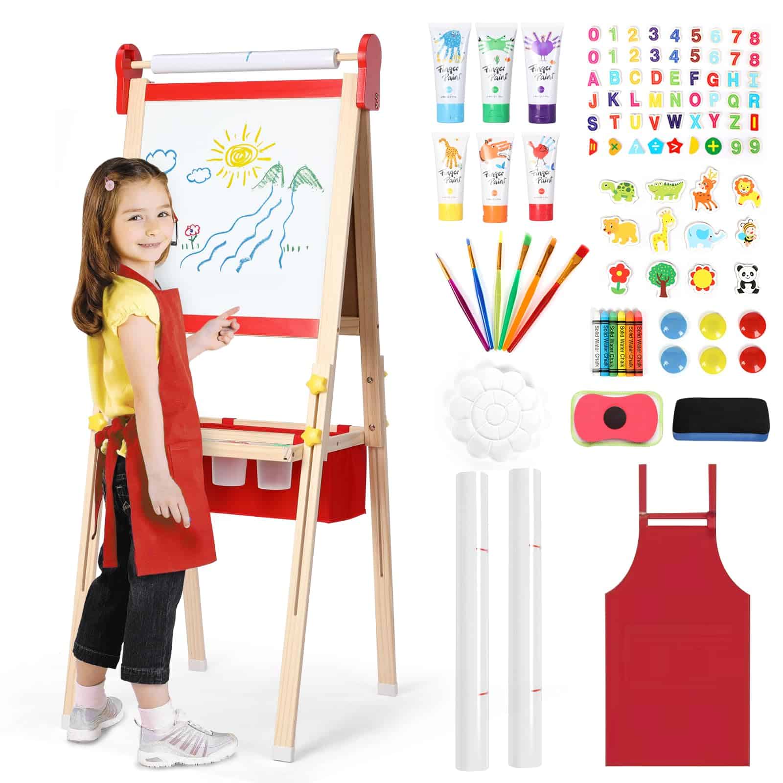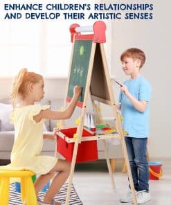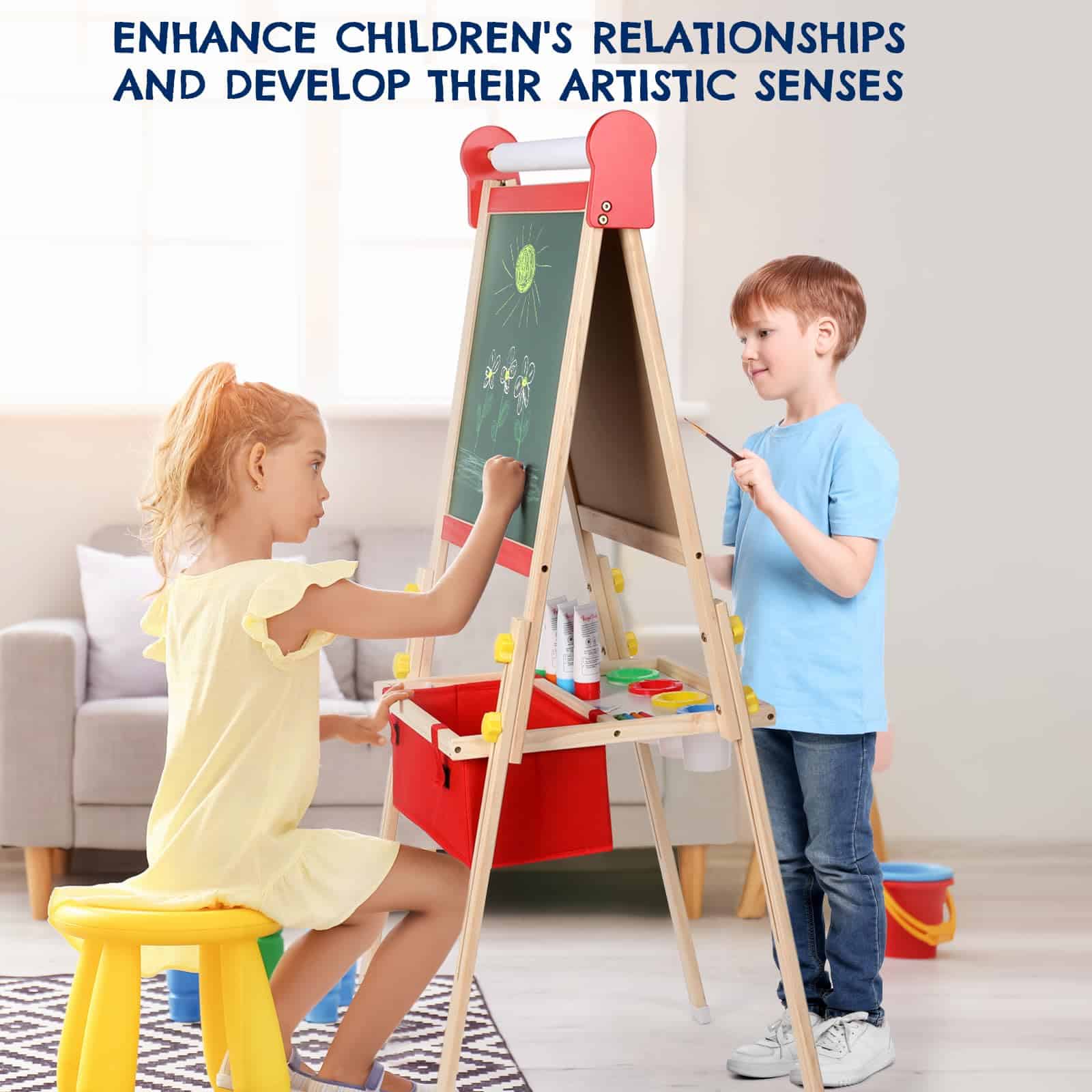 1. DISEÑO 3 EN 1: Pizarra y pizarra blanca magnética, puede soportar que 2 o más niños dibujen juntos, Nuestro caballete de arte para niños se puede utilizar como pizarra con escritura y creación con tiza, también nuestra pizarra blanca lo es. Y el caballete de arte para niños con un rollo de papel, se puede fijar en la pizarra o pizarra magnética de arriba, con el set de caballete de arte para niños incluido para crear como desee, lo que puede mejorar la relación entre los niños.
