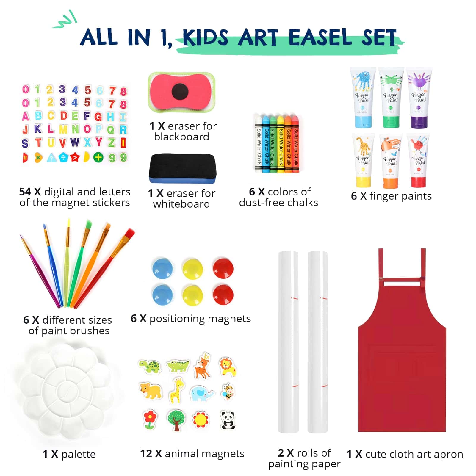 2. SUMINISTROS DE ARTE PARA NIÑOS RICOS: 54 dígitos y letras de pegatinas magnéticas, 12 imanes de animales, 6 colores de tiza sin polvo (para dibujar en la pizarra), 6 tamaños diferentes de pinceles cada uno, 6 imanes de posicionamiento, 6 pinturas de dedos, 4 cajas de pintura, 2 rollos de papel para pintar, 2 borradores, para pizarra y pizarra blanca, un lindo delantal de arte hecho en tela, una paleta de colores.