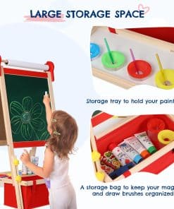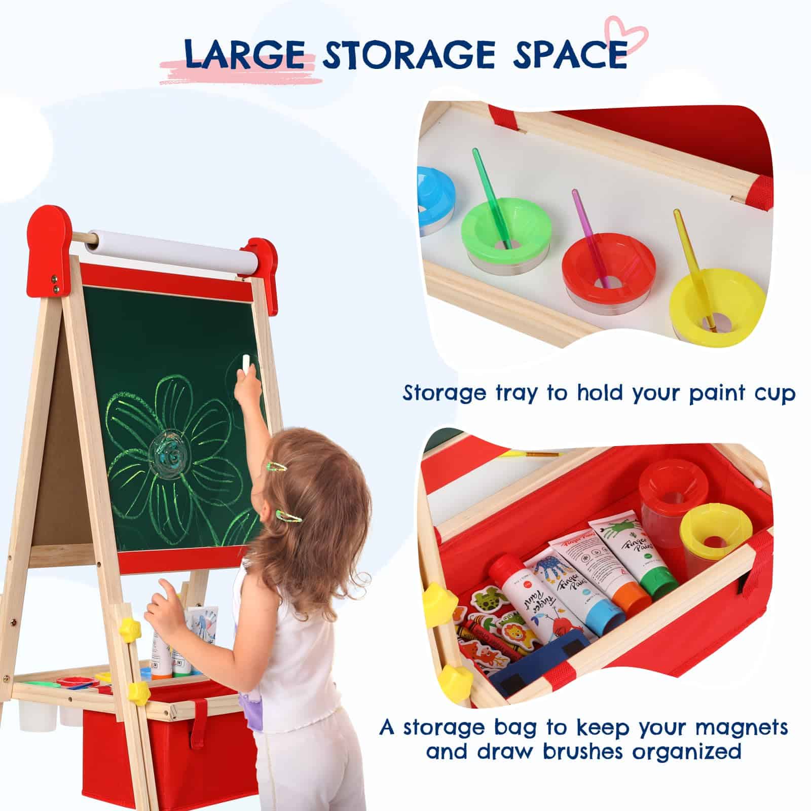 4. DISEÑO DE ALMACENAMIENTO EXQUISITO: el caballete para niños cuenta con un estante y una bolsa de tela debajo donde se pueden guardar pinturas y pinceles, permitiendo a los niños crear y jugar libremente mientras desarrollan sus habilidades de organización.