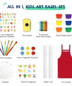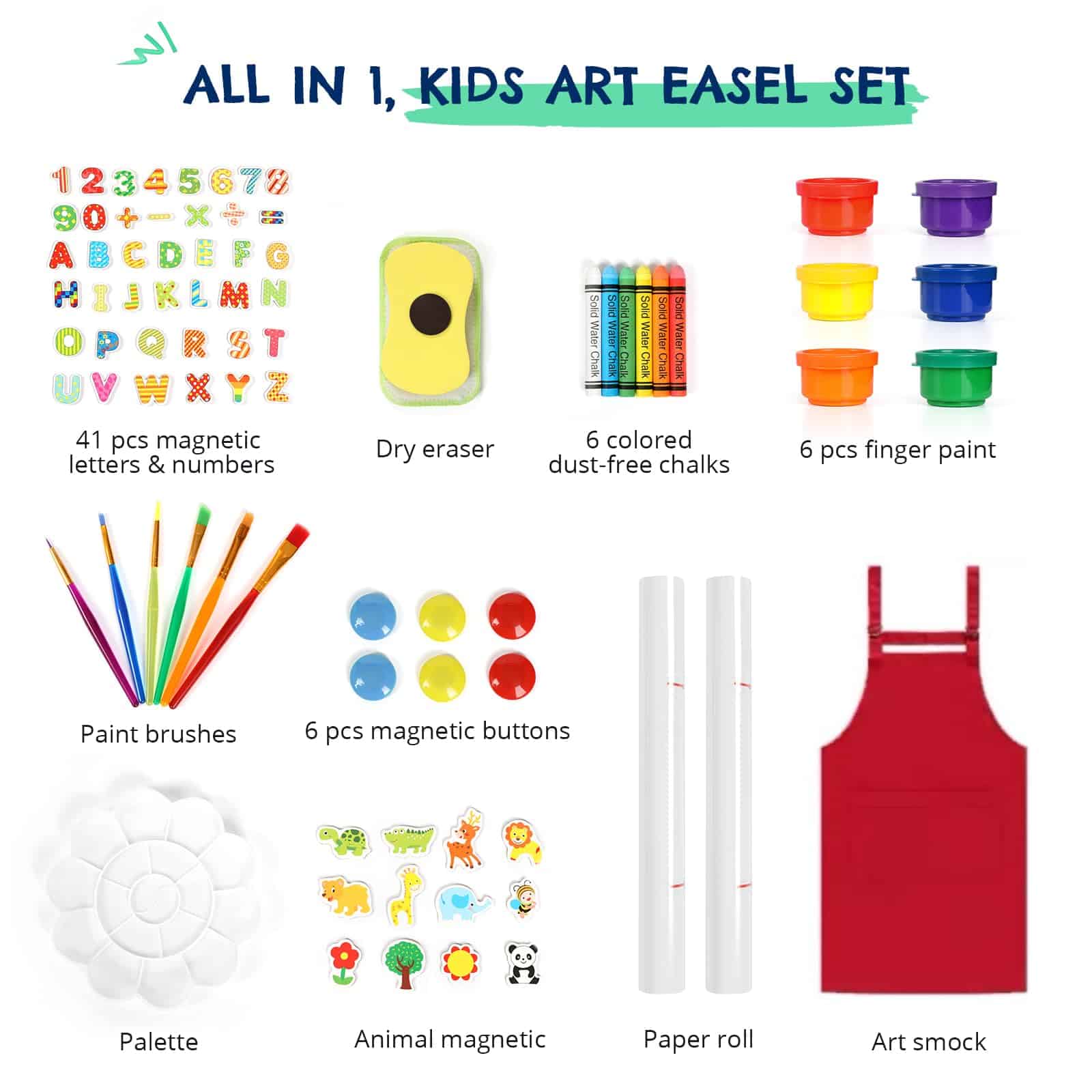 2. SUMINISTROS DE ARTE PARA NIÑOS: 41 dígitos y letras de pegatinas magnéticas, 12 imanes de animales, 6 colores de tizas sin polvo (para dibujar en la pizarra), 6 diferentes tamaños de pinceles de pintura cada uno, 6 imanes de posicionamiento, 6 pintura para dedos, 4 cajas de pintura, 2 rollos de papel de pintura, un borrador en seco, un delantal de arte lindo hecho en tela, una paleta de colores.