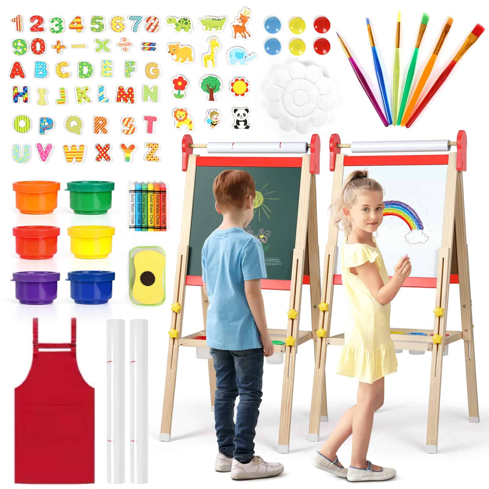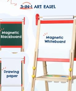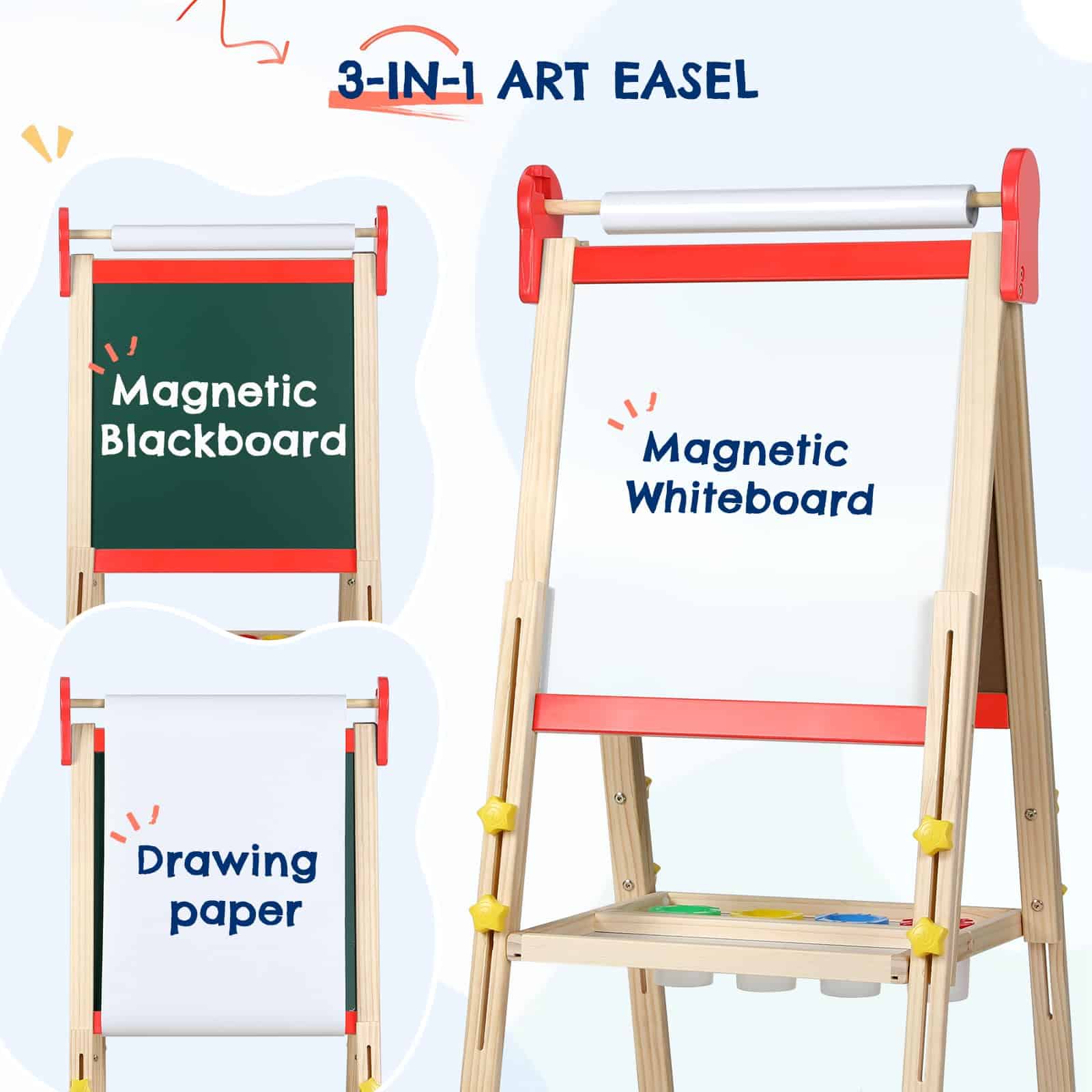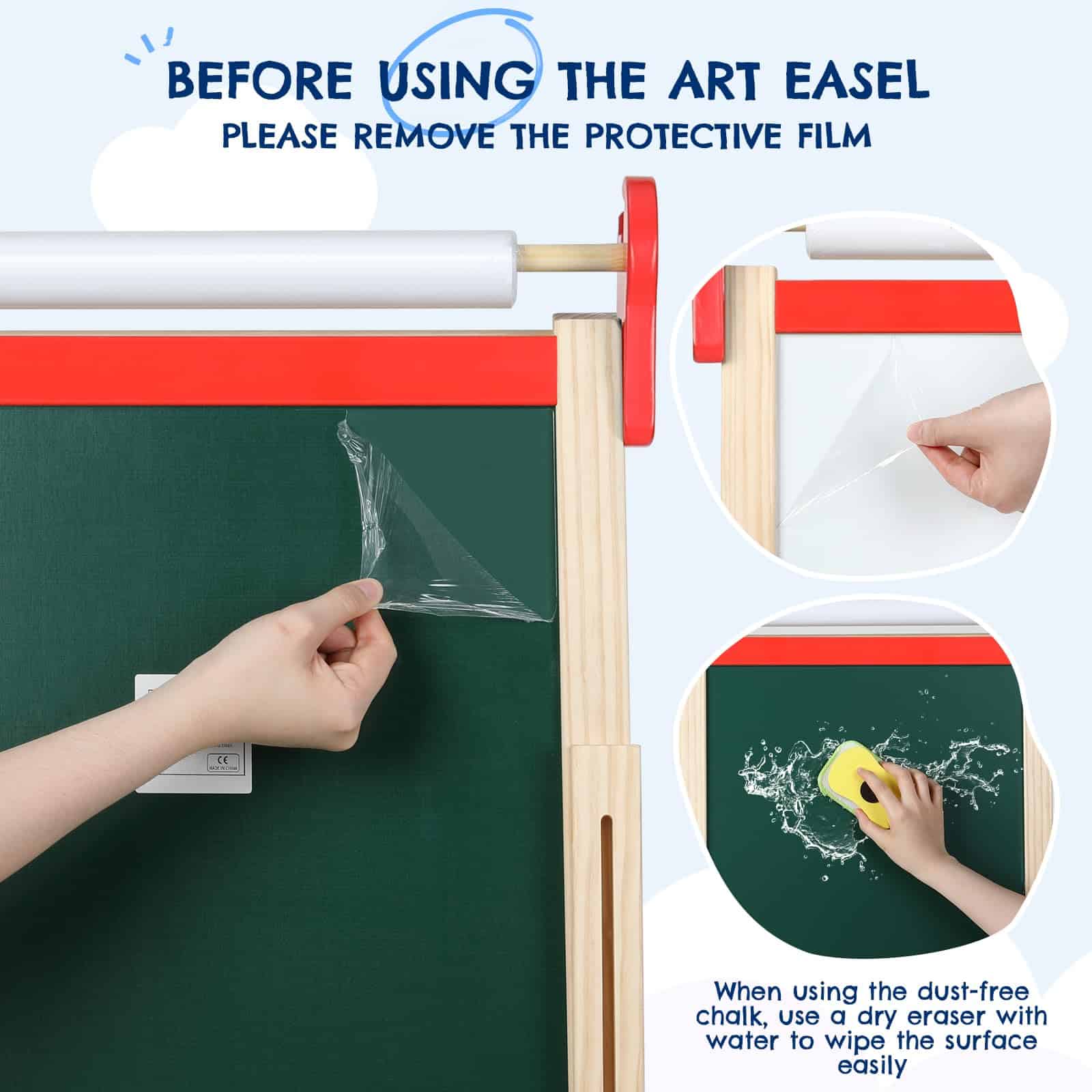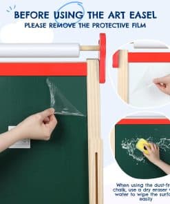 1. 3 en 1 diseño: Pizarra y pizarra blanca, puede soportar que 2 o más niños dibujen juntos. Nuestro caballete de arte para niños se puede utilizar como pizarra con escritura y creación de tiza, también nuestra pizarra blanca. Y el caballete de arte para niños con un rollo de papel, puede fijarse en la pizarra o pizarra magnética de arriba, con el conjunto de caballete de arte para niños incluido para crear como desee, lo que puede mejorar la relación entre los niños.