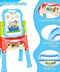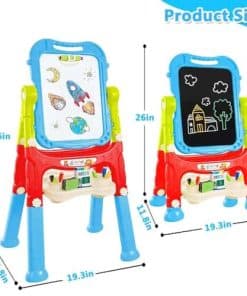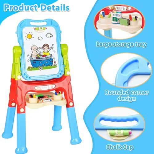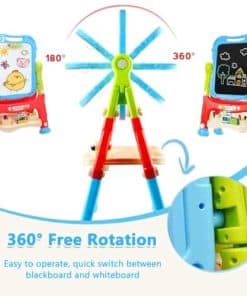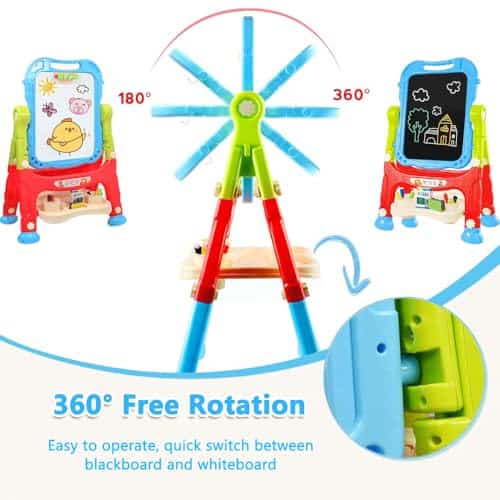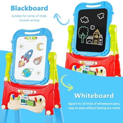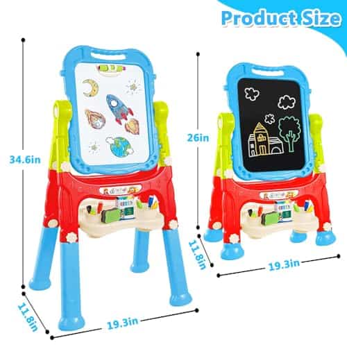 2. Giro libre y fácil montaje: Nuestro tablero de dibujo de doble cara es muy fácil de instalar y también se puede desmontar para usar como tablero de dibujo portátil. El diseño de giro libre de 360 grados también ayuda a los niños a pintar en cualquier ángulo y la altura se puede ajustar de 26 pulgadas a 34.6 pulgadas para satisfacer la demanda de altura de pintura diferente.