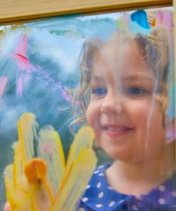 1. Diseño versátil para exploración creativa: cuenta con un caballete de doble cara con un lado que presenta un panel de plástico transparente para pintar y el otro una pizarra para dibujos con tiza, perfecto para que los niños de 3+ años exploren diversos medios artísticos.