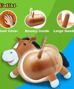 ¡Haz ejercicio, desarrolla balance y mantén a tus hijos activos con su nuevo mejor amigo: Mr Jones el caballo saltarín! Es un animal inflable para montar estilo saltarín. Los niños y bebés adoran la cubierta de peluche suave y abrazable, y rápidamente aprenden a sentarse y saltar hacia adelante mientras desarrollan balance y coordinación. Los padres disfrutan de la bomba de aire de mano conveniente incluida, y descansan mientras sus pequeños vaqueros y vaqueras queman esa energía extra saltando por todos lados. Nuestro colorido y caballo saltarín inflable es estable, grueso y duradero pero suave y ligero. Se verá genial en cualquier salón de juegos. No sólo es divertido Mr Jones y toda nuestra línea de caballos saltarines se usan en jardines de infancia y escuelas como herramienta de motricidad fina. Nuestro caballo saltarín Mr Jones cuenta con dos cómodas asas y patas suaves que lo ayudan a mantenerse en su lugar. Los terapeutas lo emplean para estimular la creatividad, el movimiento y mejorar habilidades motoras. Pero creamos a Mr Jones pensando en la diversión, tal como un verdadero caballo de montar para niños debería ser. Cuarto de niños los caballos saltarines con cubierta de peluche de WALIKI cuentan con 4 patas suaves permitiéndole mantenerse de pie por sí solo. Es colorido y hermoso, añadiendo un toque extra a la habitación de tu hijo. Nuestros juguetes saltarines están diseñados con amor en Miami, Florida, y hechos con cuidado en la R.P. China. El tapón es una pieza pequeña así que los niños menores de 3 años deben tener supervisión de un adulto. ¡Mantén a tus hijos felices y entretenidos con nuestra línea de juguetes saltarines con cubierta de peluche! Los juguetes WALIKI basados en Florida fueron creados gracias a una abuela generosa y hermosa. Su nieto creció para convertirse en un experto en juguetes y comenzó la compañía. Nuestro objetivo es mantener a los niños felices, ocupados y saludables haciendo que el ejercicio sea divertido. ¡Ofrecemos una gran variedad de juguetes saltarines montables, casas de saltos y estamos orgullosos revendedores de Gymnic, que fabrica el caballo Rods. Mira nuestros otros productos en venta.