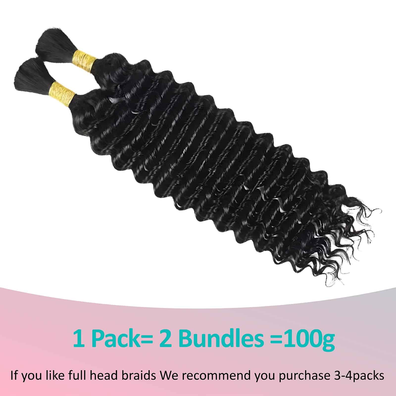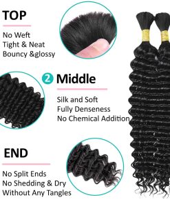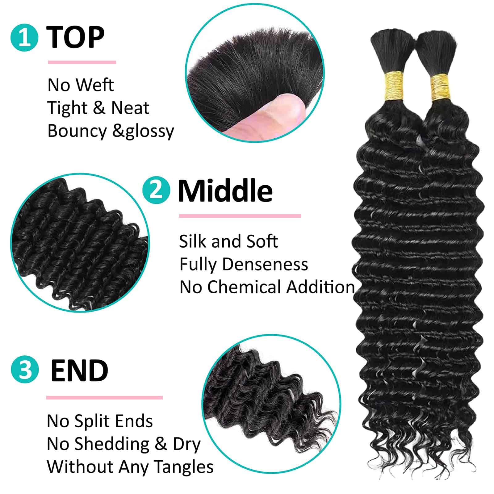 3. Característica del cabello: El cabello humano a granel ondulado profundo para trenzas micro es 100% cabello humano real, se puede aclarar, colorear o teñir, rizado y estilizado, con extremos suaves preestirados. Sin enredos, sin caída, sin olor ni químicos.