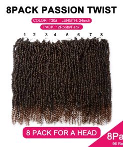 2. Tamaño y Color – (8 Paquetes, Pelo de Trenza de Pasión 24 Pulgadas, T30). Opciones de pelo de trenza de pasión: 5 tamaños (10 pulgadas, 12 pulgadas, 14 pulgadas, 18 pulgadas, 24 pulgadas), 5 colores disponibles (1B, 2, 4, T27, T30). Peso: 50g/paquete, 12 hebras por paquete. Normalmente 8 paquetes son suficientes para una cabeza.